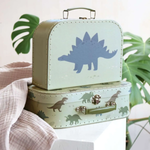 Deze set van twee koffertjes staat schattig op de baby- of kinderkamer, is leuk om mee te spelen en handig voor het opbergen van speelgoed. De koffertjes komen in twee verschillende formaten en zijn gemaakt van stevig karton met polyester stiksels. Zowel het grote als kleine koffertje hebben een metalen handgreep en gesp waardoor kleine schatten bewaard zullen blijven.