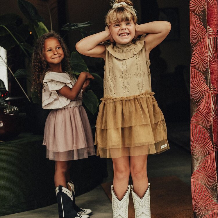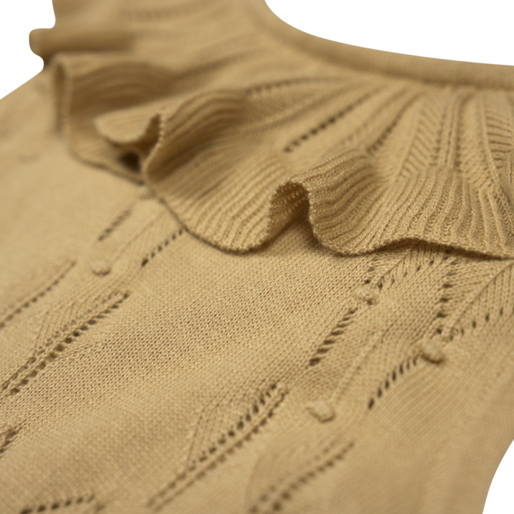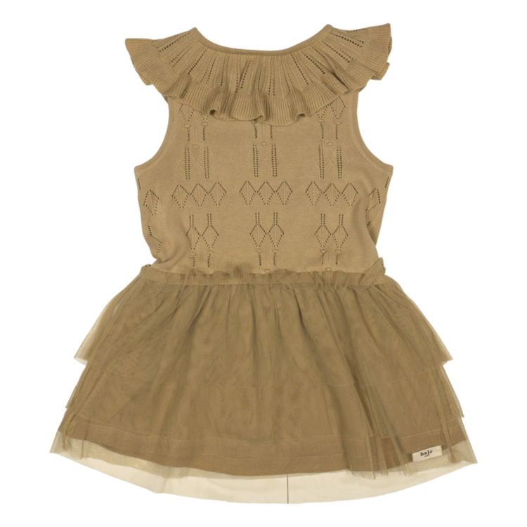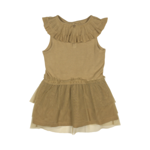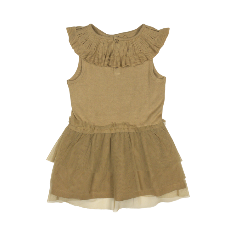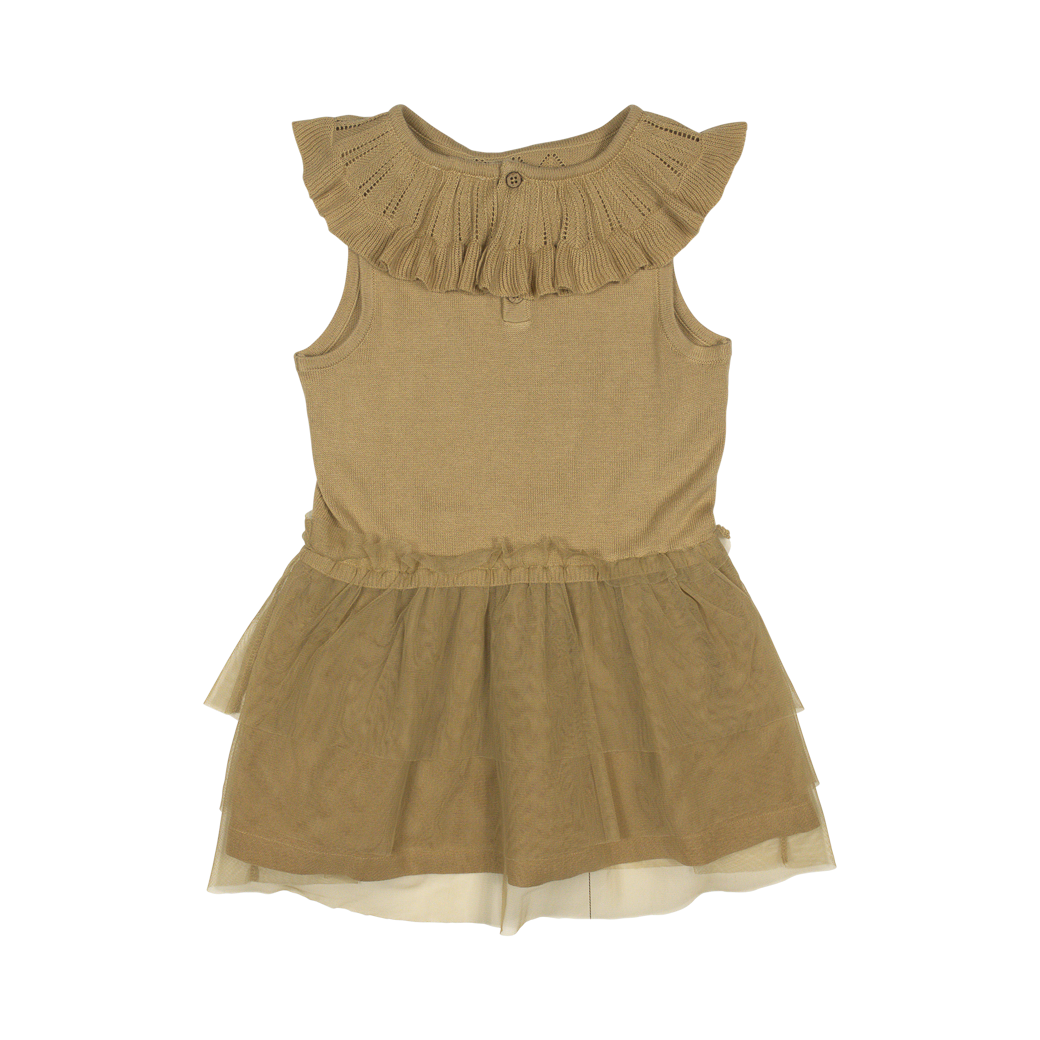 Verbluffend, prachtig, geweldig, mooi - noem maar op. Deze zandkleurige jurk van kwalitatief hoogwaardig katoenen breiwerk verdient zeker een soortgelijke titel. Het tule detail bij de rok voegt een authentieke twist toe aan dit luxueuze stuk.