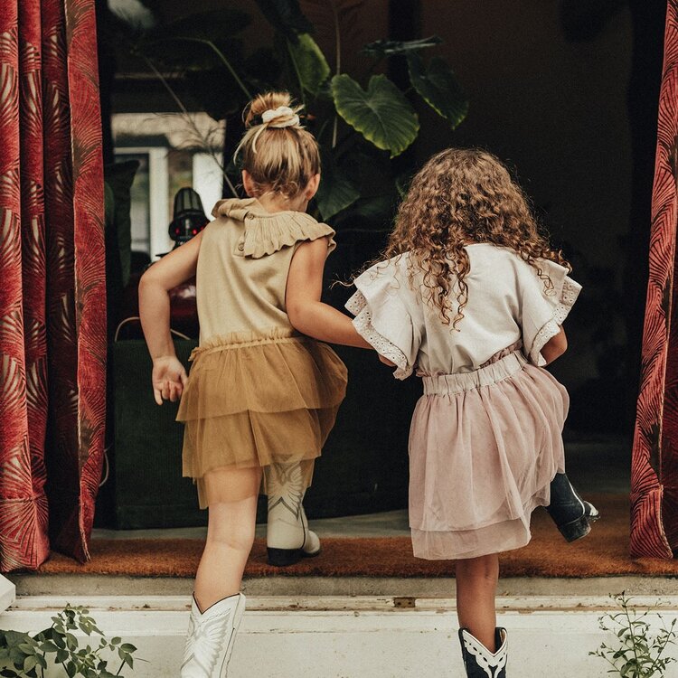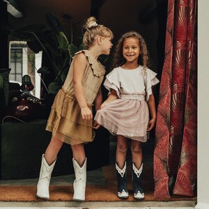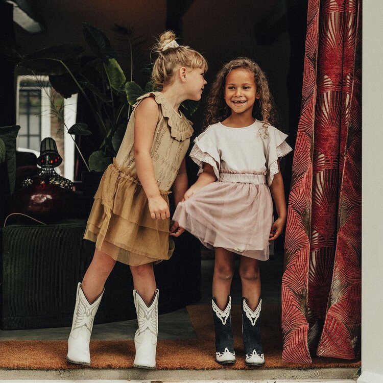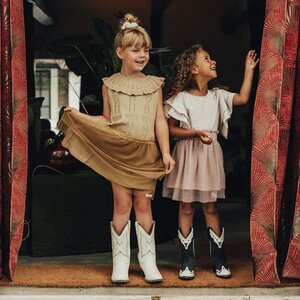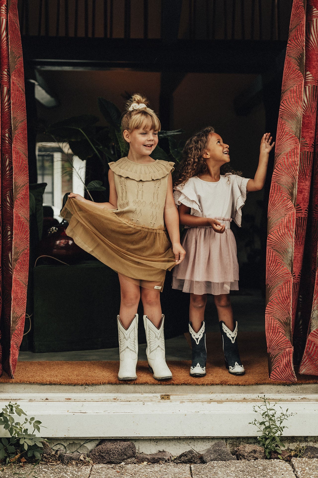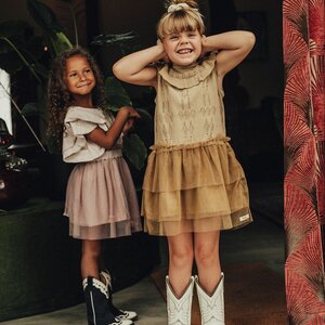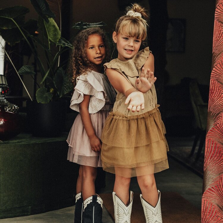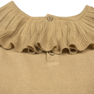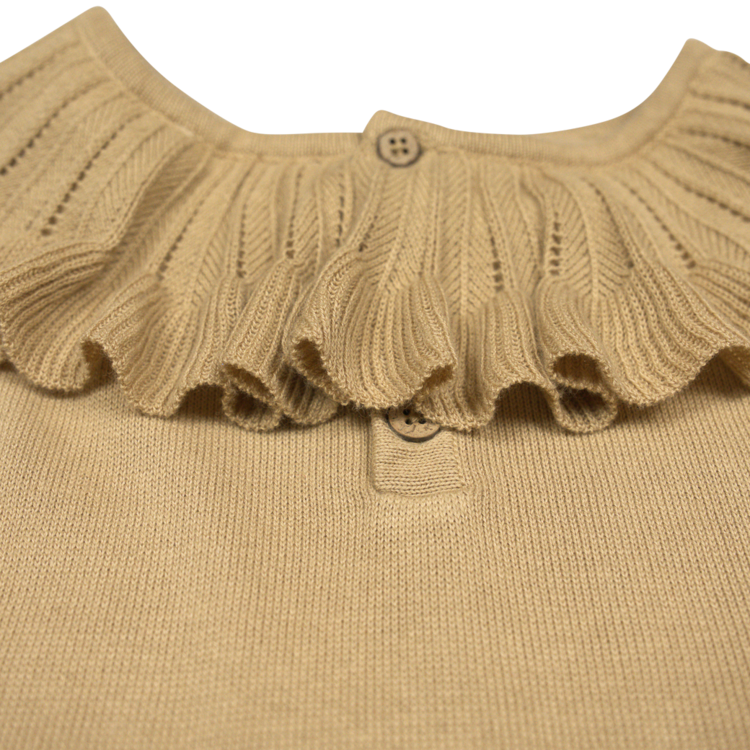 Verbluffend, prachtig, geweldig, mooi - noem maar op. Deze zandkleurige jurk van kwalitatief hoogwaardig katoenen breiwerk verdient zeker een soortgelijke titel. Het tule detail bij de rok voegt een authentieke twist toe aan dit luxueuze stuk.