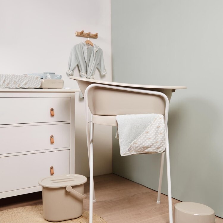 Kortom, je hebt maar één standaard nodig waarop je de bademmer, maar later ook het badje kan plaatsen. Natuurlijk is een goede houding erg belangrijk tijdens het badderen en ook wil je alles bij de hand hebben. De badstandaard is daarom uitgerust met een handdoekenrek.