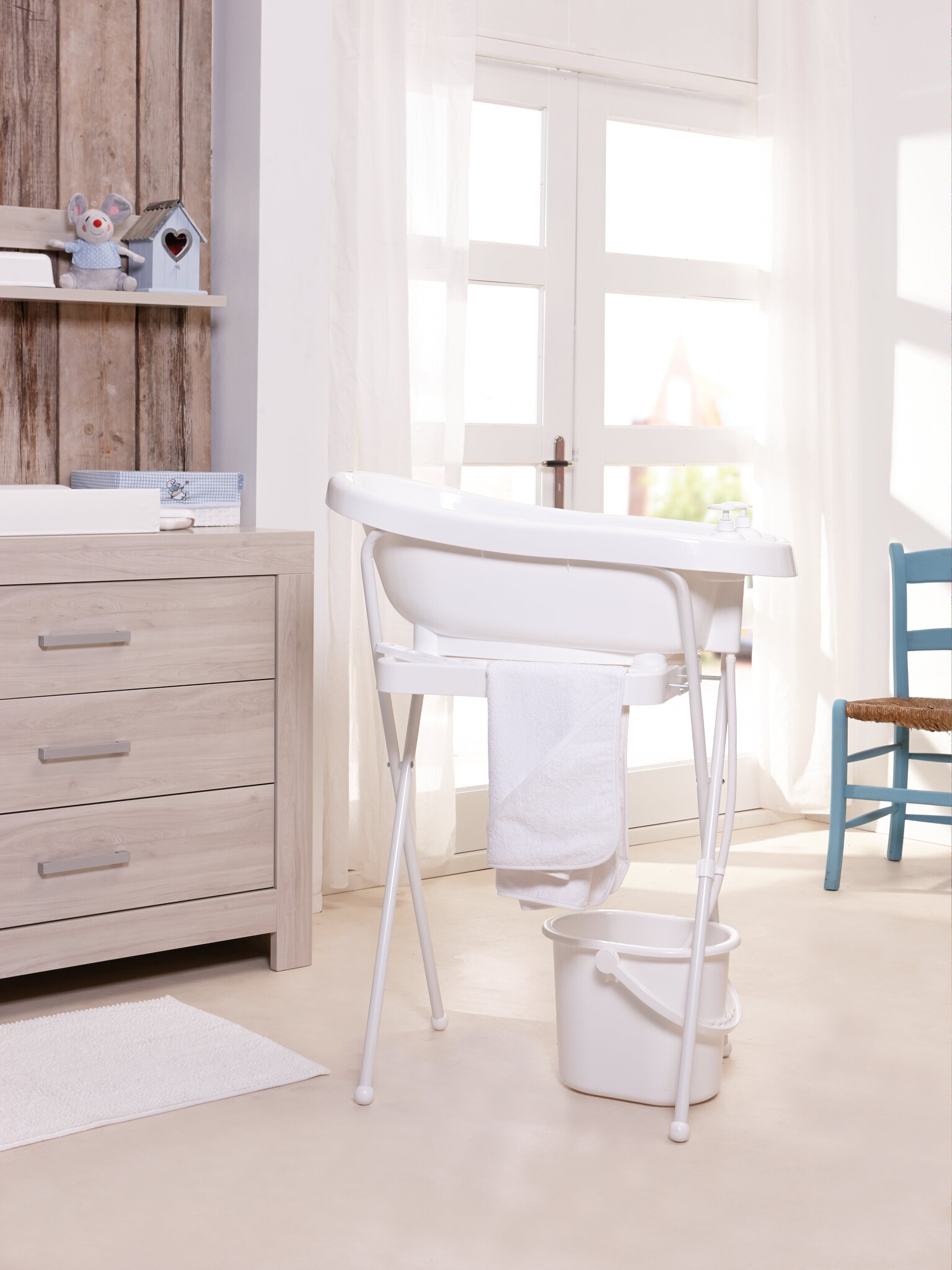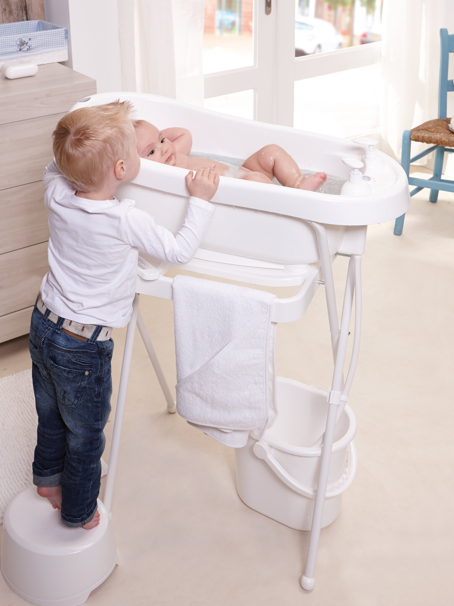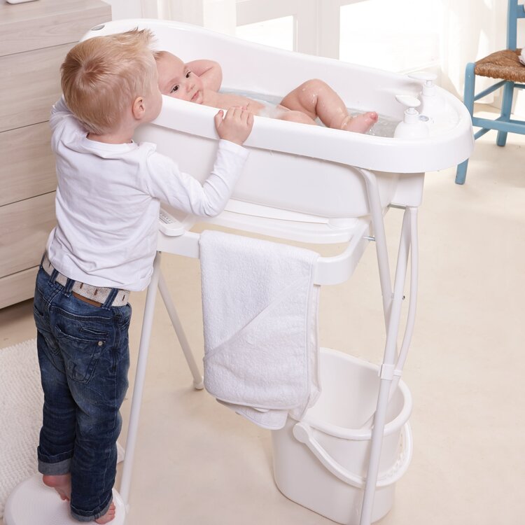 De bébé-jou inklapbare badstandaard is uitgerust met een speciaal “CLICK systeem”. Met behulp van dit innovatieve systeem plaats je het bébé-jou babybad 256 en thermobad 260 heel eenvoudig, "met 2 clicks" muurvast op de standaard. Net zo gemakkelijk “click” je de badjes weer los, door aan de onderzijde van de badstandaard het systeem in te knijpen. Heel handig, ook de bébé-bubble (bademmer) is geschikt voor deze badstandaard. Kortom je hebt maar één standaard nodig waarop je de bademmer, maar later ook het badje kan plaatsen. Natuurlijk is een goede houding erg belangrijk tijdens het badderen en ook wil je alles bij de hand hebben. De badstandaard is daarom uitgerust met een handdoekenrek en verkrijgbaar in twee verschillende hoogtes: 98cm en 103cm.