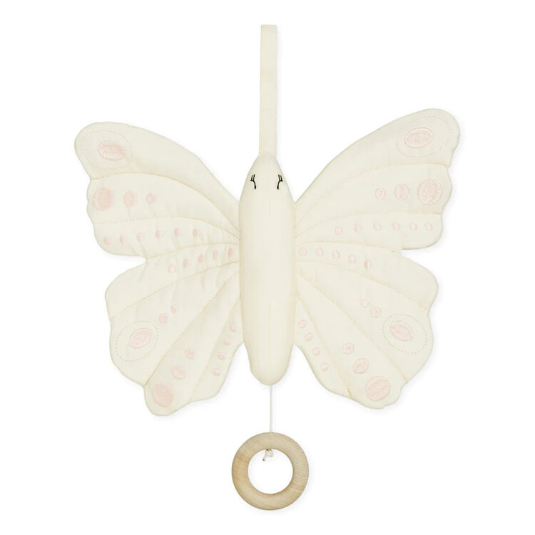 Prachtige vlindermuziekmobiel die verfijning en poëzie toevoegt aan elke kinderkamer. De mobiel is perfect om boven het bedje of de commode te hangen, omdat het zorgt voor visuele contemplatie en zachte hoorbare stimulatie terwijl het de rustgevende melodie "Lullaby" van Johannes Brahms speelt. De Vlinder Mobiel is een ideale match met verschillende prints en producten in de collectie die versierd zijn met vlinders en botanische schoonheid. De Vlinder Mobiel voegt zich bij Cam Cam's serie van iconische mobiles waarmee het gemakkelijk gecombineerd kan worden voor een eclectische esthetiek.