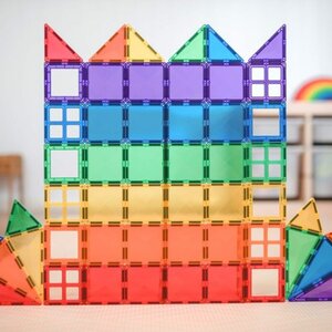 Met grote en kleine vierkanten, plus drie soorten driehoeken in zes levendige regenboogkleuren, is dit pakket de perfecte introductie tot Connetix-spel of als aanvulling op groeiende magnetische tegelcollecties.