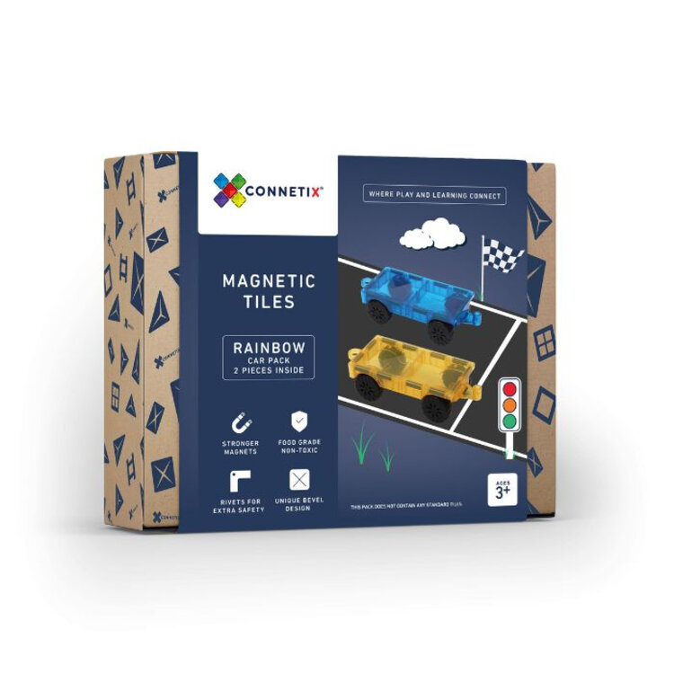 De Connetix Tiles Auto Pack is de perfecte toevoeging voor autoliefhebbers die hun magnetische tegels willen combineren met een beetje snelheid en avontuur! Dit pakket bevat twee stoere, snelle auto's waarmee kinderen hun Connetix-bouwwerken kunnen "racen" en nog meer speelmogelijkheden kunnen ontdekken.