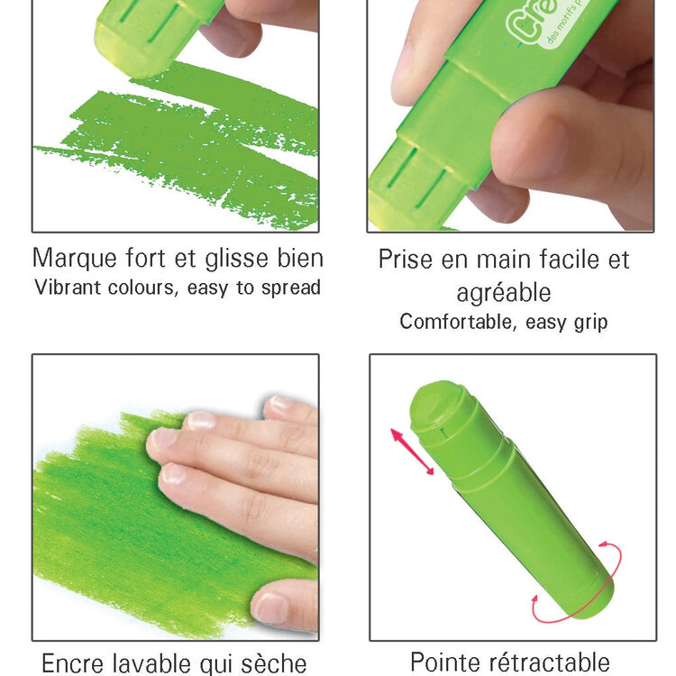 Een verpakking met 9 vetpotloden met gouache-effect. Inkt droogt snel. Het is uiterst wasbaar op de huid. Ideaal om de verbeelding en creatieve activiteiten van jonge kinderen te stimuleren.