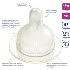 De Difrax flessenspeen Wide Large voor de brede S-fles heeft een zachte ronde tepelvormige speen die lijkt op de moederborst. Hierdoor is borst- en flesvoeding goed te combineren.