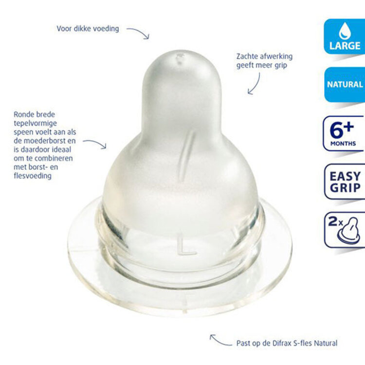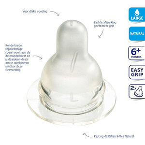 De Difrax Flessenspeen Natural Large voor de smalle S-fles heeft een zachte ronde tepelvormige speen die lijkt op de moederborst. Hierdoor is borst- en flesvoeding goed te combineren.