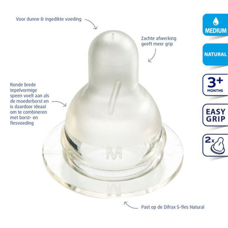 De Difrax Flessenspeen Natural Medium voor de smalle S-fles heeft een zachte ronde tepelvormige speen die lijkt op de moederborst. Hierdoor is borst- en flesvoeding goed te combineren.