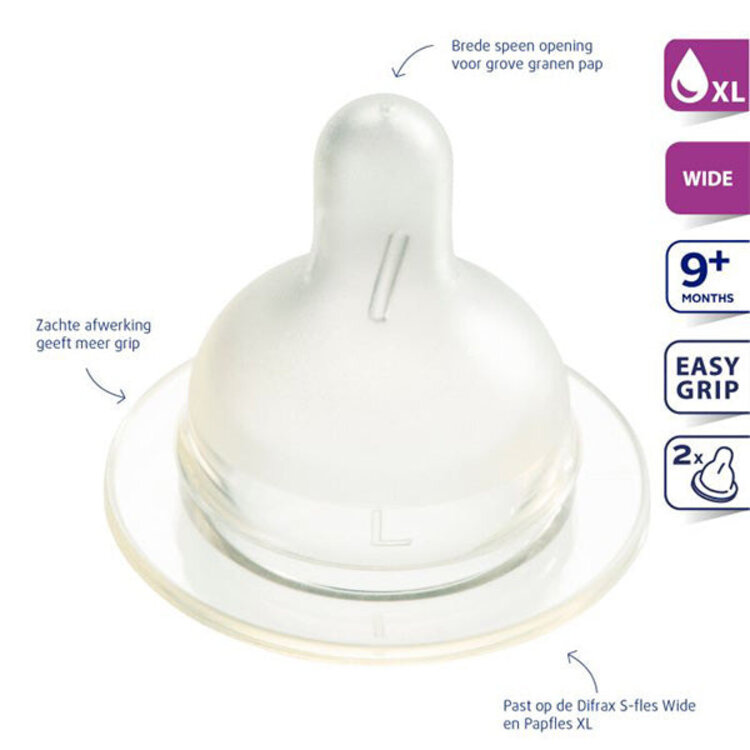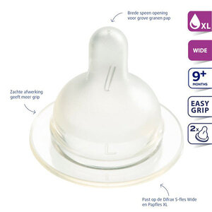 Speciaal voor papflessen heeft Difrax nu ook de XL flessenspeen ontwikkeld. Als opvolger van de large flessenspeen heeft deze extra large flessenspeen een nog grotere drinkopening die er voor zorgt dat je kindje rustig stevige pap kan drinken. Deze flessenspeen past op de Wide S-flessen van 200 ml en 310 ml.