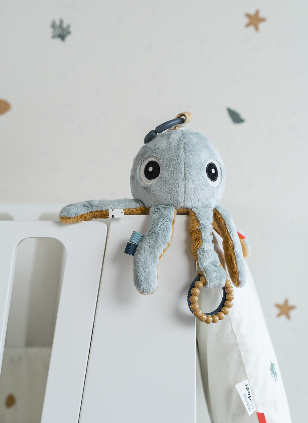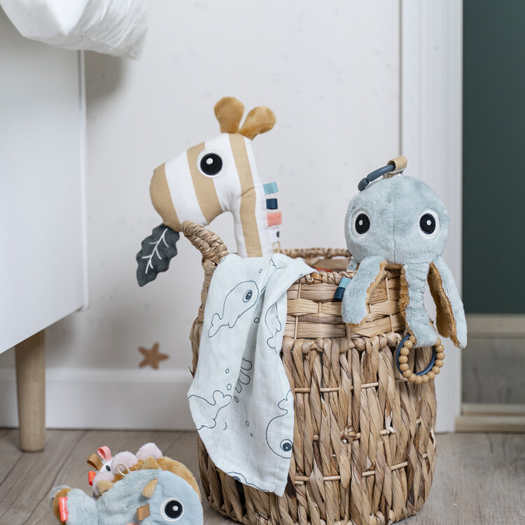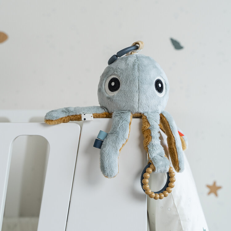 Baby's ontwikkelen hun fijne motoriek al in een vroeg stadium. De kleine handjes van je kindje kunnen de kwal gemakkelijk vasthouden, ermee rammelen of spelen. Het speeltje heeft een mooie poeder kleur en leuke details. Bevestig het speeltje eenvoudig met de ring aan de kinderwagen, box, of het autostoeltje. Zo gaat hij overal mee naar toe.