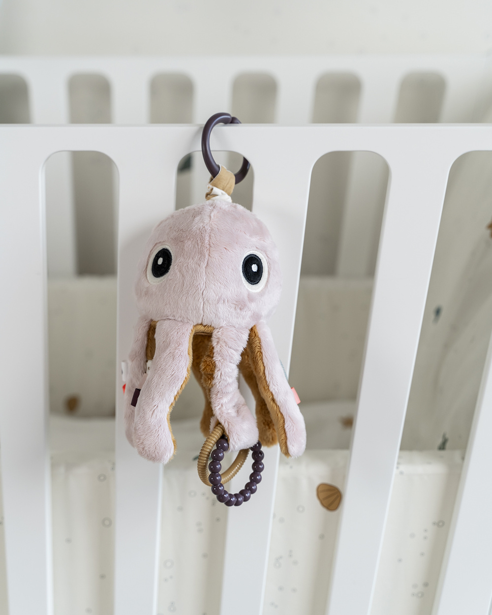 Baby's ontwikkelen hun fijne motoriek al in een vroeg stadium. De kleine handjes van je kindje kunnen de kwal gemakkelijk vasthouden, ermee rammelen of spelen. Het speeltje heeft een mooie poeder kleur en leuke details. Bevestig het speeltje eenvoudig met de ring aan de kinderwagen, box, of het autostoeltje. Zo gaat hij overal mee naar toe.