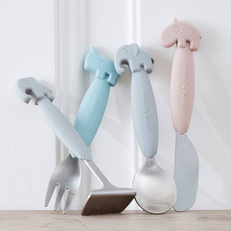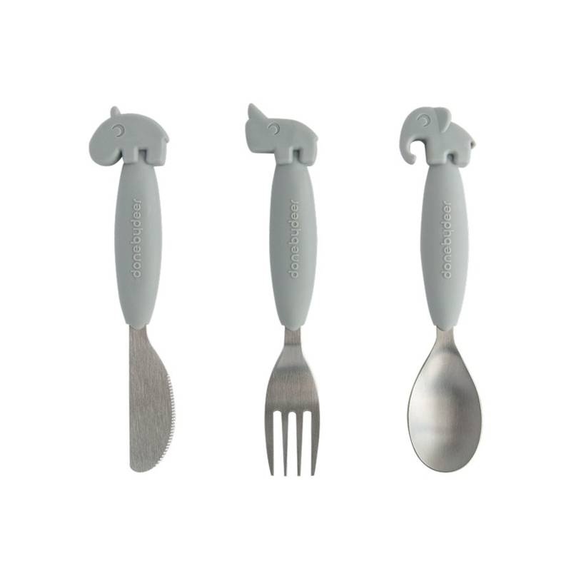 Leuk en zeer praktisch Yummy kinderbestek van Done by Deer met een grijze mes, lepel & vork.