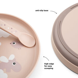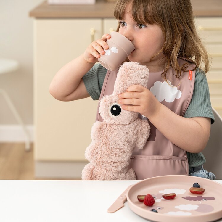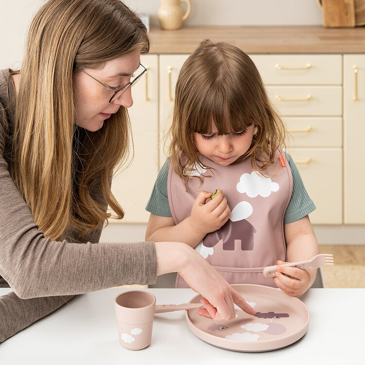 Het bordje is bedrukt met een speels Happy clouds-motief. Croco, Ozzo en Birdee verkennen de wereld tussen de wolken en nodigen je kind uit om nieuwe smaken en consistenties te ontdekken. Het donkere poeder van de basis voegt een leuk tweekleurig detail toe.