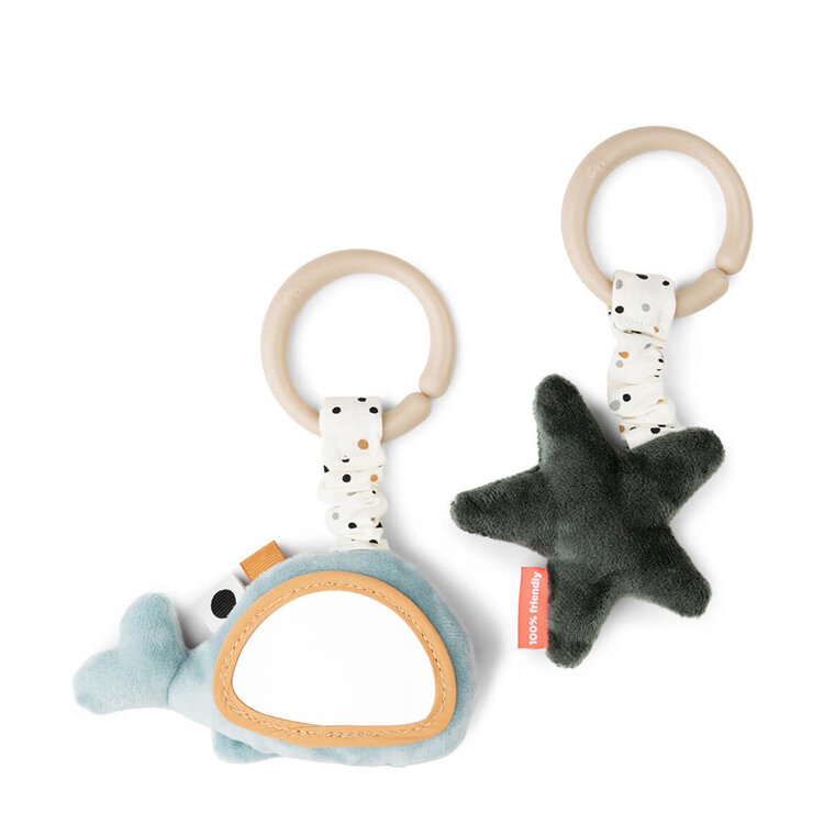 De knuffelige Wally heeft een grappig babyspiegeltje en de coole zeester heeft een zintuiglijk kreukelgeluid. Beide speeltjes zijn voorzien van sensorische tags om te ontdekken en zijn eenvoudig op te hangen met behulp van de praktische speelgoedlink. De schattige hangende speelset bestaat uit een blauwe Wally en een groene zeester beide met een elastische band met speelse stippen.