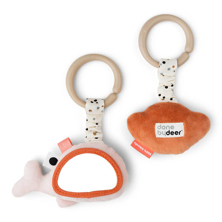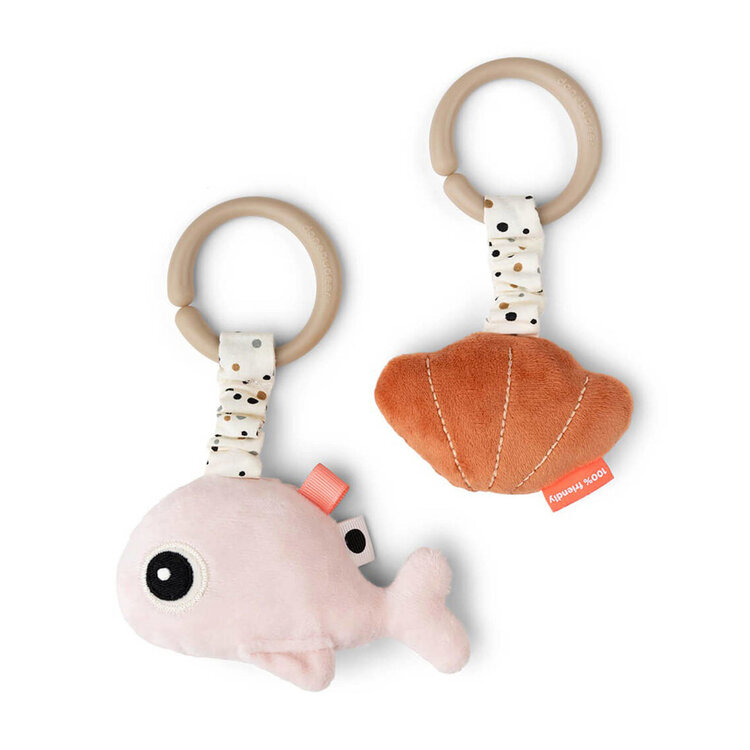 De knuffelige Wally heeft een grappig babyspiegeltje en de coole zeester heeft een zintuiglijk kreukelgeluid. Beide speeltjes zijn voorzien van sensorische tags om te ontdekken en zijn eenvoudig op te hangen met behulp van de praktische speelgoedlink. De schattige hangende speelset bestaat uit een poederkleurige Wally en een papajakleurige zeeschelp, beide met een elastische band met speelse stippen.