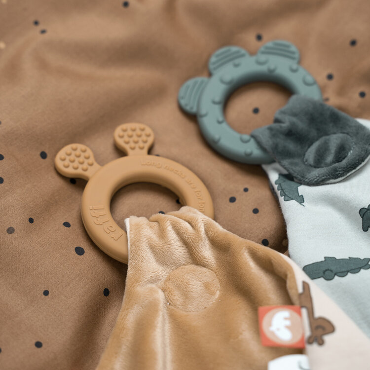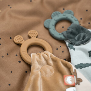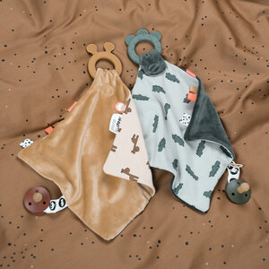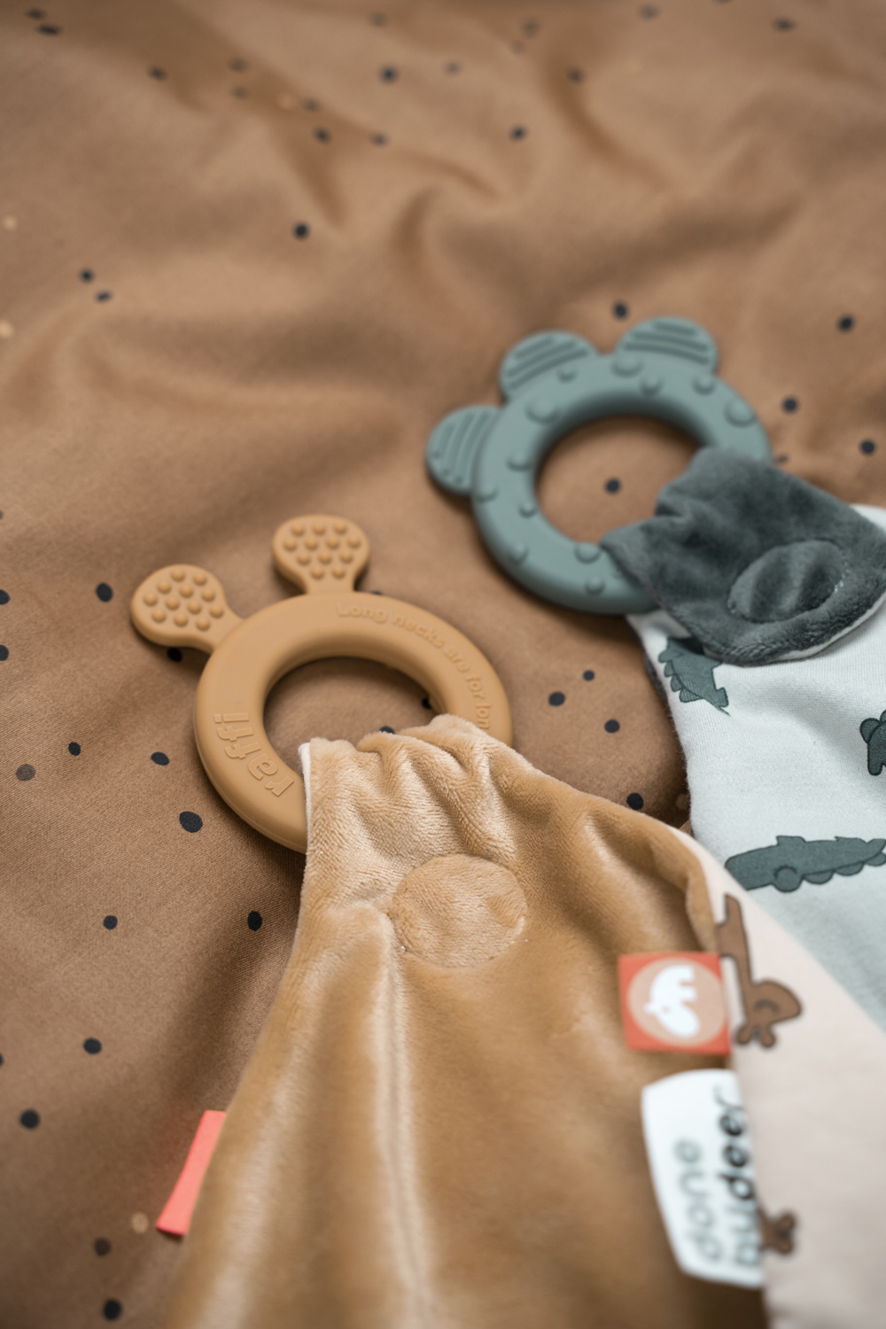 De schattige siliconen bijtring met krokodillenschubben en heeft verschillende texturen om jeukend tandvlees te stimuleren en te kalmeren, kan worden losgemaakt en op zichzelf worden gebruikt. Ook is er een praktische klittenbandsluiting en een elastische lus om een fopspeen aan te bevestigen, zodat je 'm altijd dichtbij kan houden. Een echte baby-musthave in zacht groene tinten!