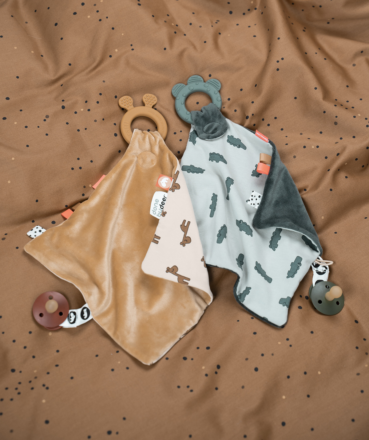 Aan het doekje van Croco zitten allemaal friemel labeltjes met verschillende kleuren en texturen die de zintuigen van je baby stimuleren.