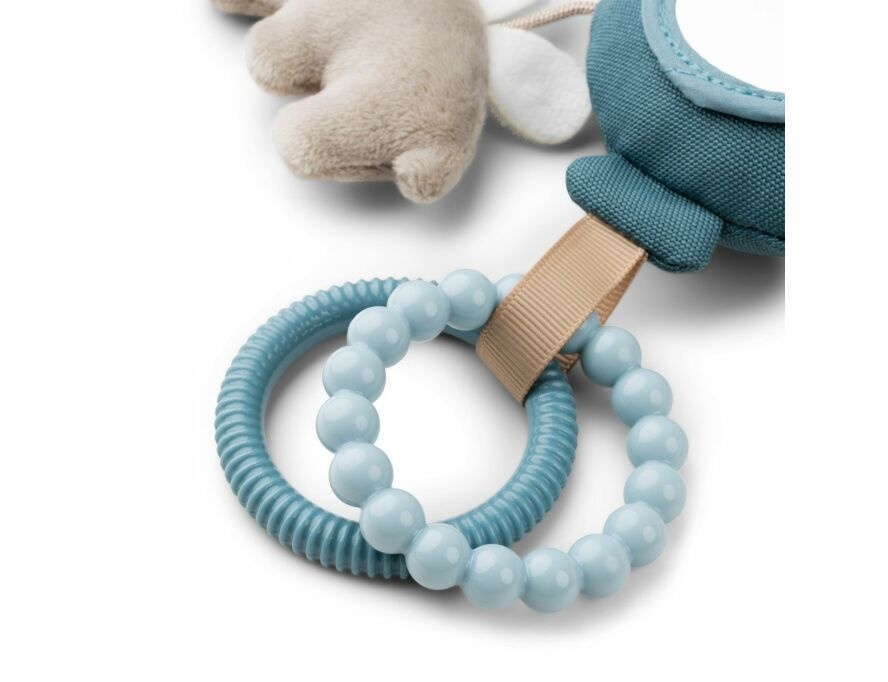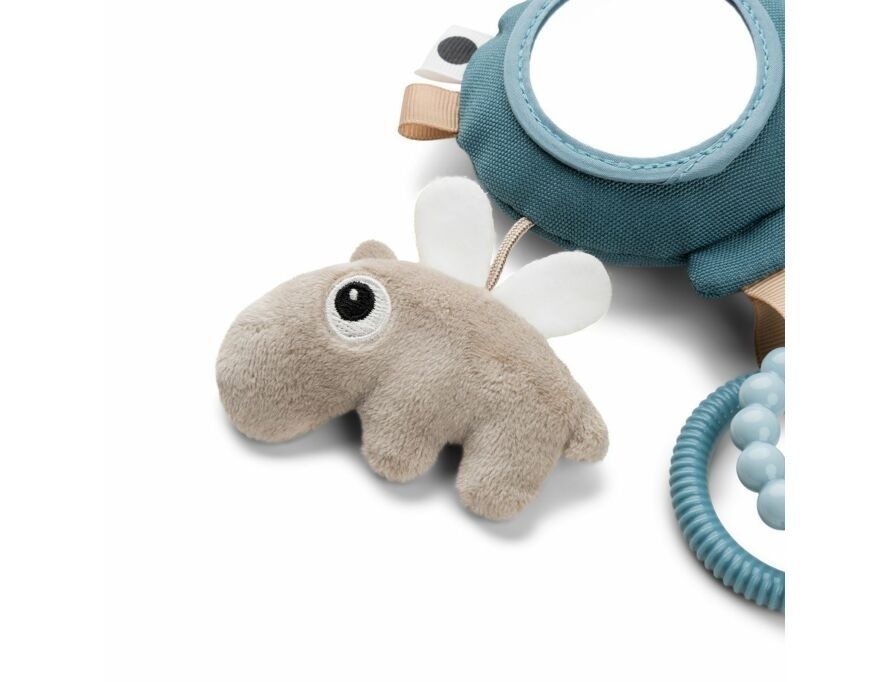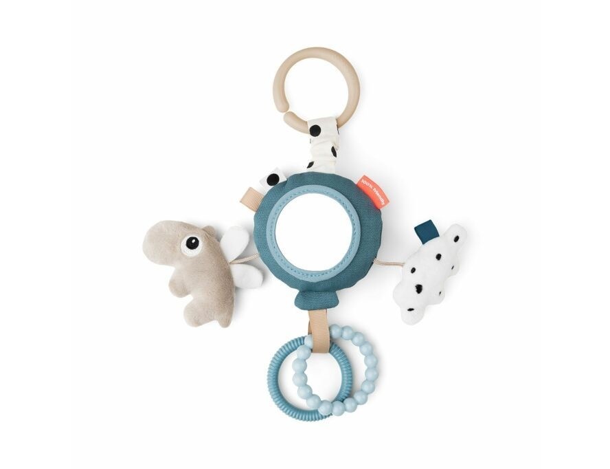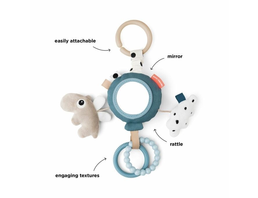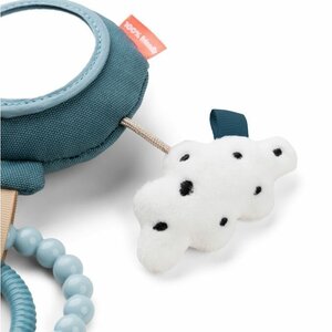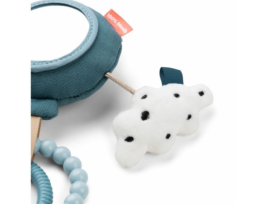 Is gemakkelijk aan de kinderwagen, autostoel of buikkussen te bevestigen. De kleintjes zullen genieten van het spelen met de activiteitenspiegel en al zijn speelse elementen. De blauwe ballon vliegt weg met een zandkleurige Ozzo, twee ringen in blauwtinten en een schattige witte wolk met zwarte stippen.