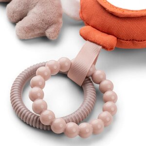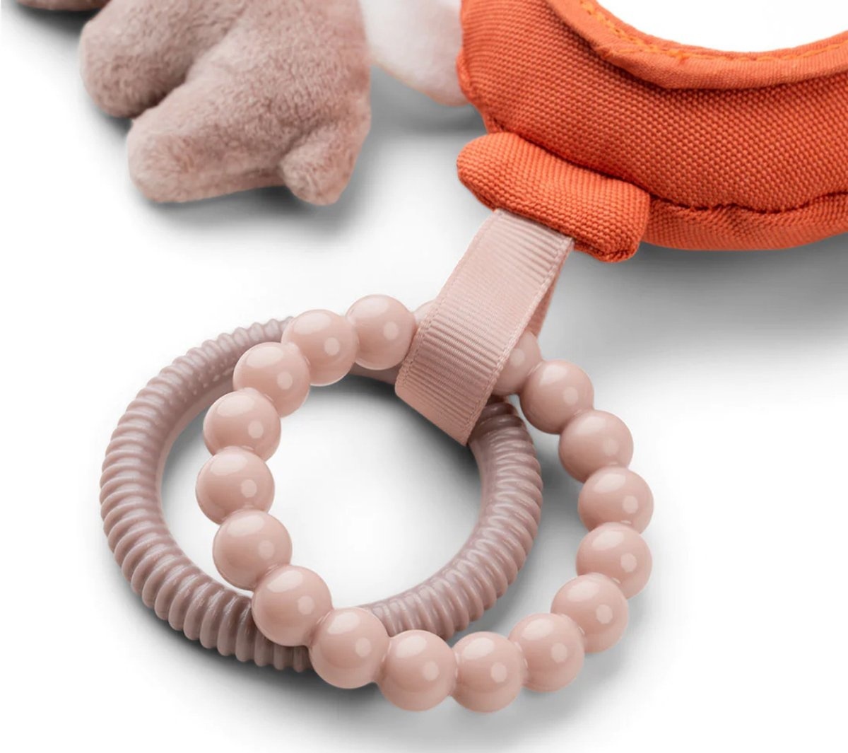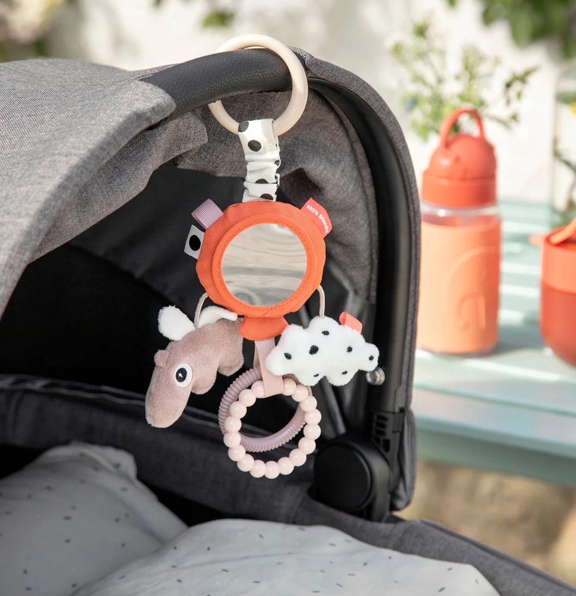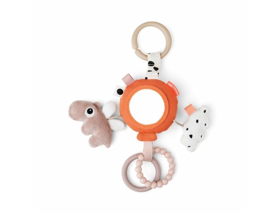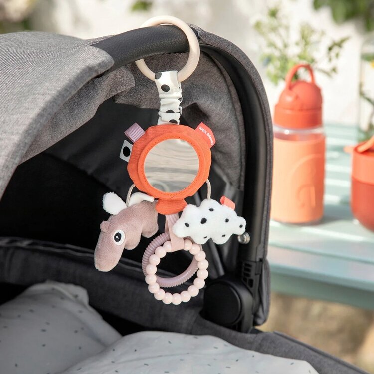 Is gemakkelijk aan de kinderwagen, autostoel of buikkussen te bevestigen. De kleintjes zullen genieten van het spelen met de activiteitenspiegel en al zijn speelse elementen. De papajakleurige ballon vliegt weg met een poederkleurige Ozzo, twee ringen in poedertinten en een schattige witte wolk met zwarte stippen.