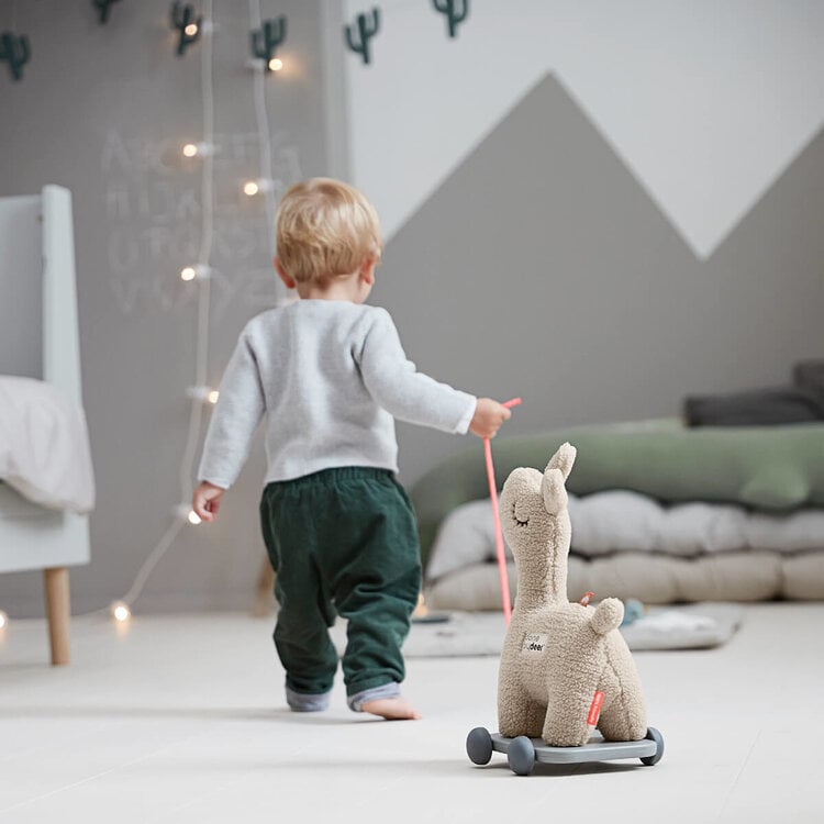 Leuk trekspeeltje met een zandkleurige zachte lama van Done By Deer op wielen.