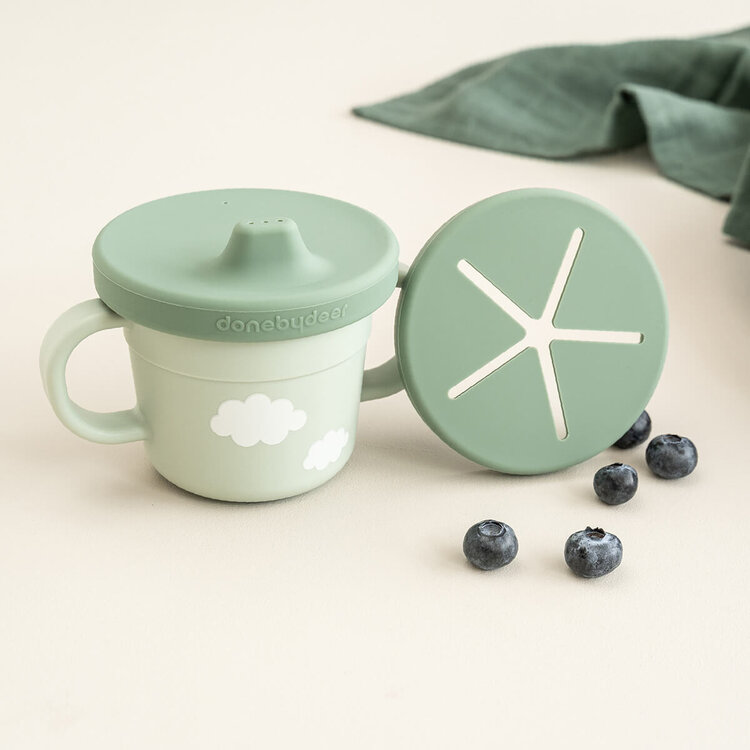 De koele groene tuit- en snackbeker is bedrukt met de hartverwarmende krokodil Croco aan de ene kant en wolkjes aan de andere kant. Het donkergroen van de tuitdeksel voegt een leuk tweekleurig detail toe.