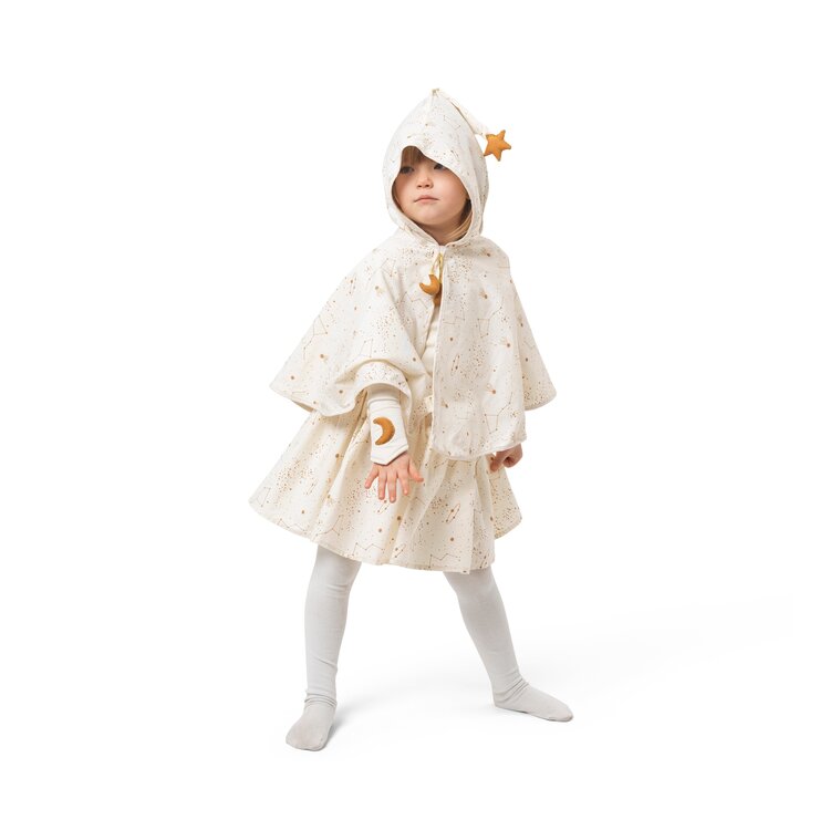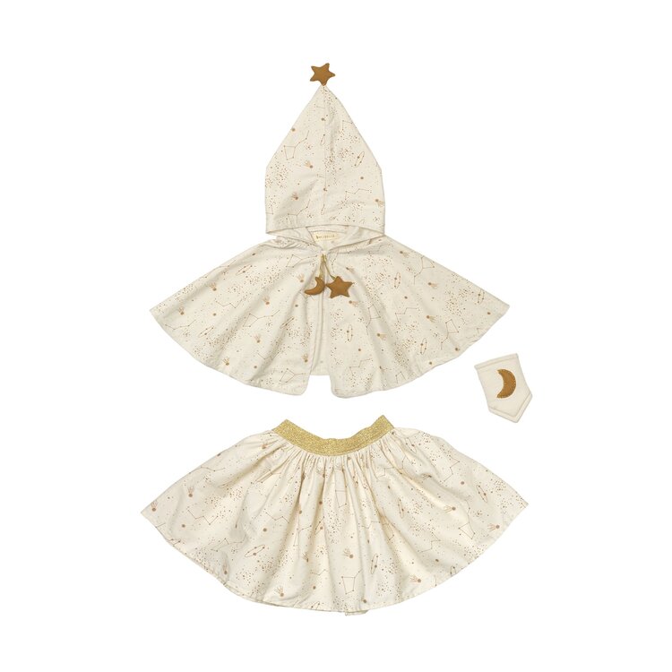 Rondfladderend bewaken de maanfeeën het Land van Fabeland en brengen schittering en vreugde aan iedereen die ze op hun weg tegenkomen. Laat je kleintje zich verkleden in onze nieuwe comfortabele Maanfeeën Set met hemelse opdruk, bestaande uit een prachtige cape met capuchon, een schattige maatvaste rok met een gouden elastiek, en een arm-pols manchet met een borduursel van de maan. Gebruik het voor een alledaags rollenspel of als een speels Halloween kostuum.