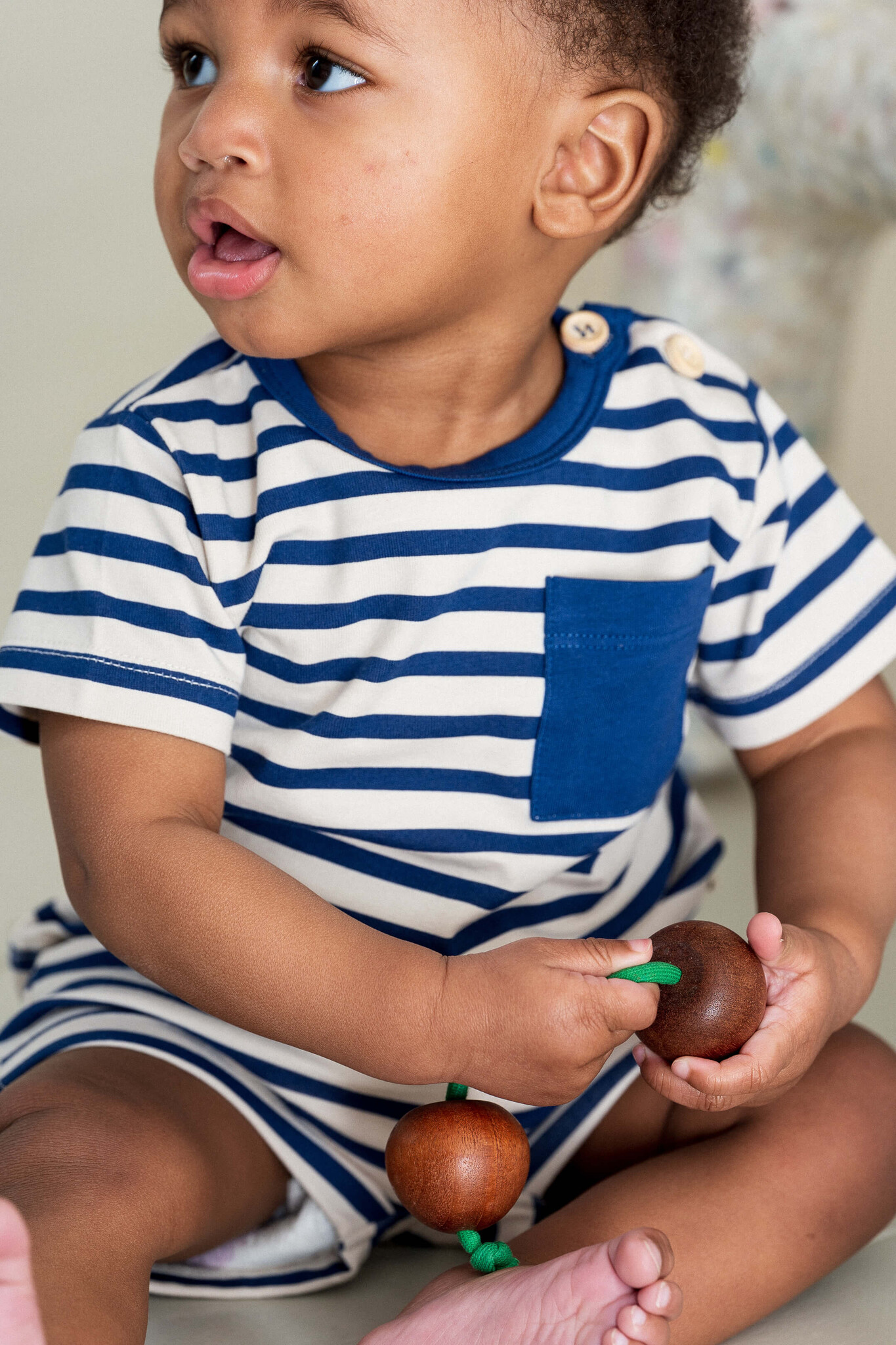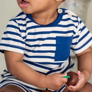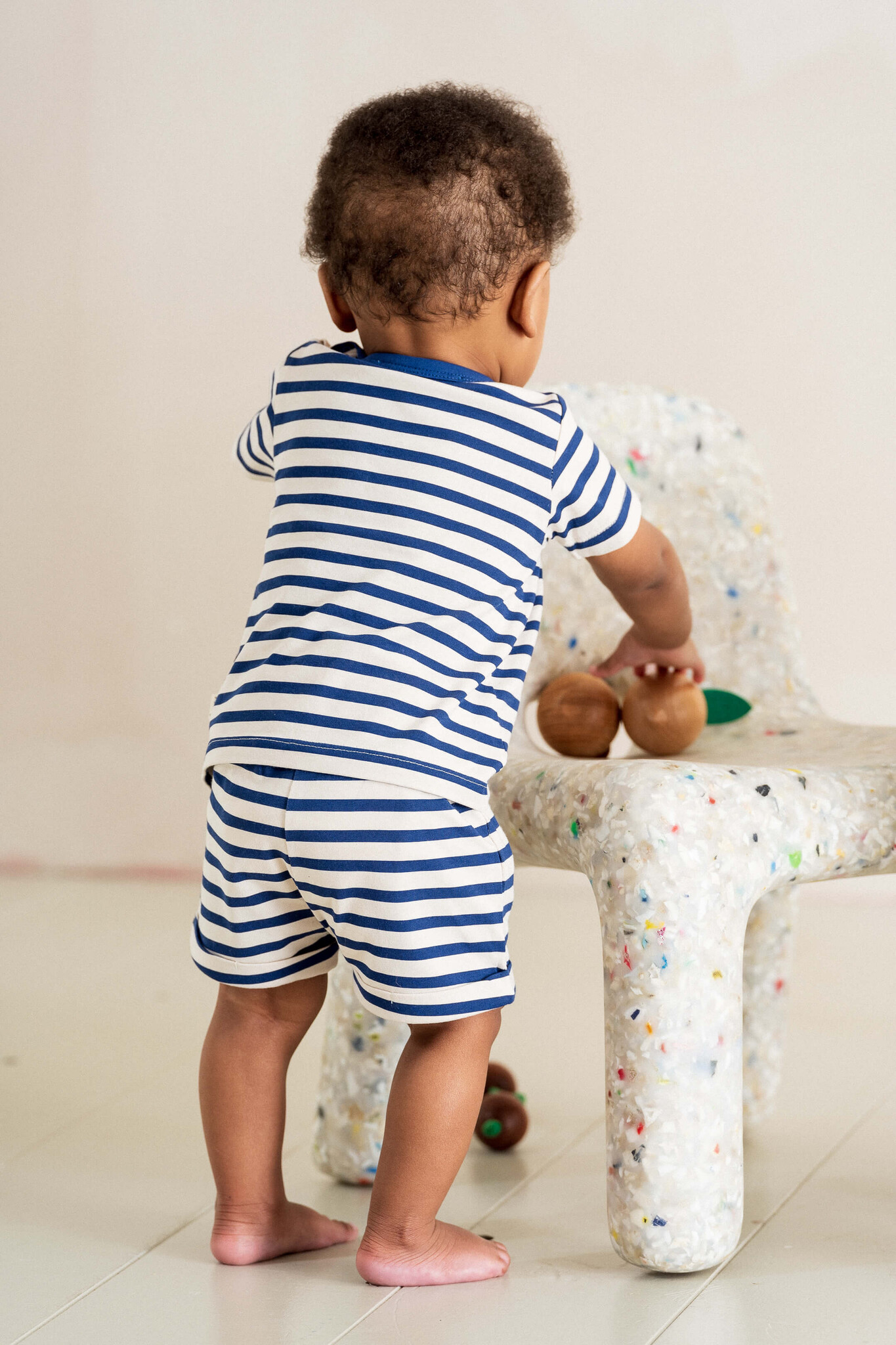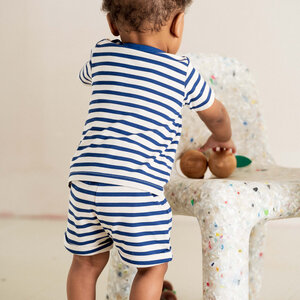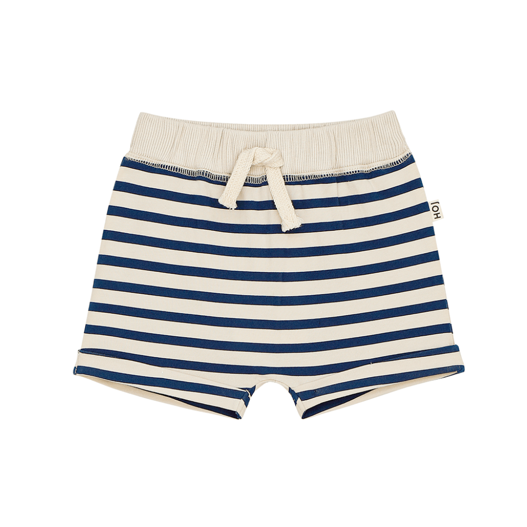 Baby Bermuda met relaxte pasvorm. Elastische tailleband in ribboord kwaliteit met crème katoenen koord detail. Opgerolde onderzijde detail in drie kleurvarianten.