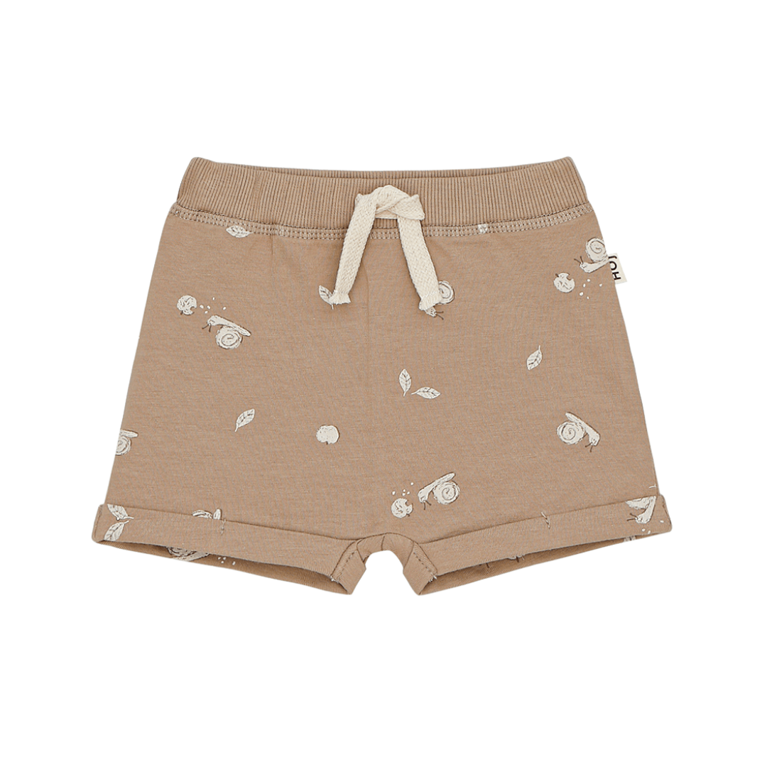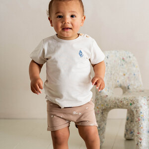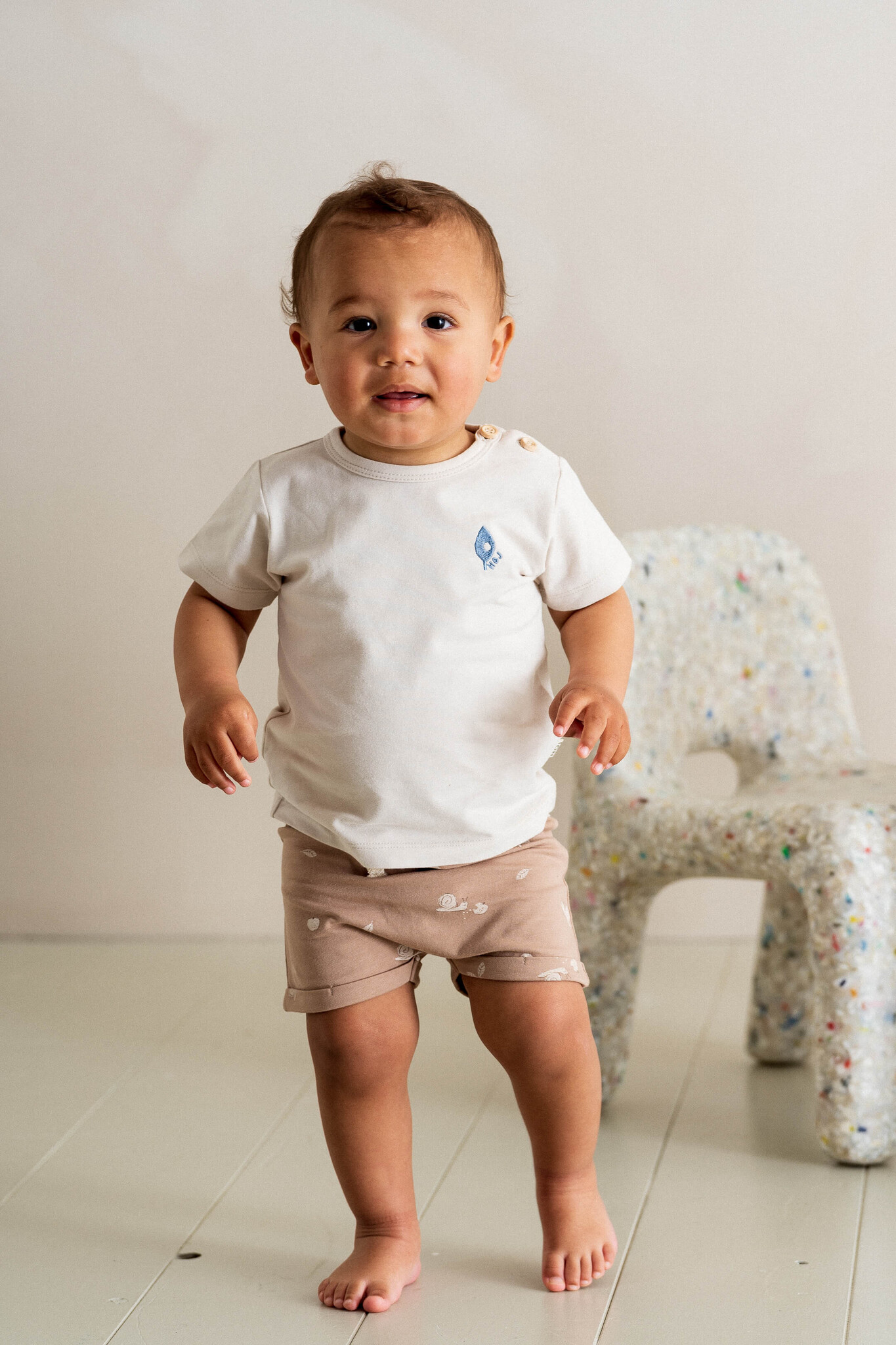 Baby Bermuda met relaxte pasvorm. Elastische tailleband in ribboord kwaliteit met crème katoenen koord detail. Opgerolde onderzijde detail in drie kleurvarianten.