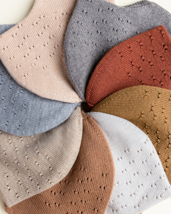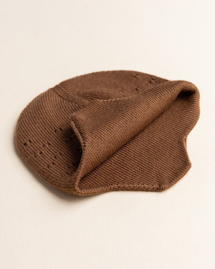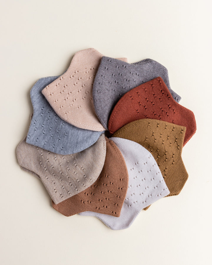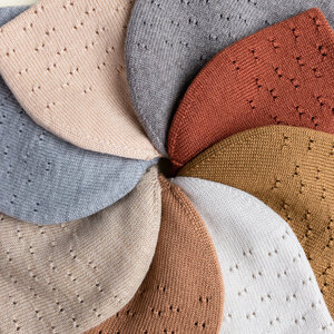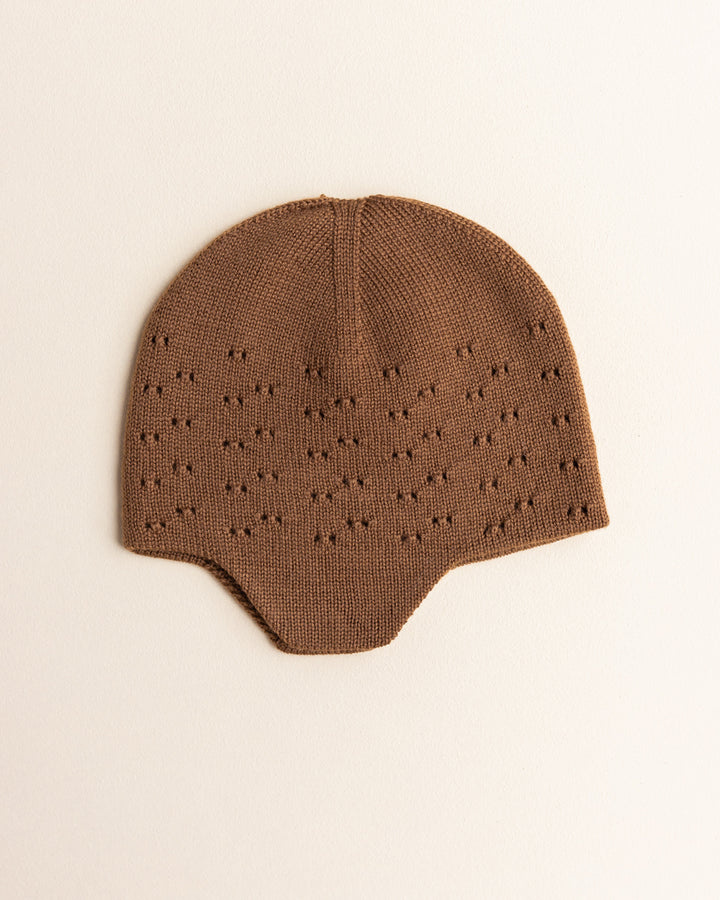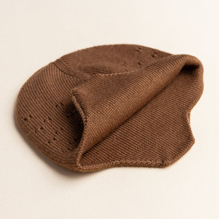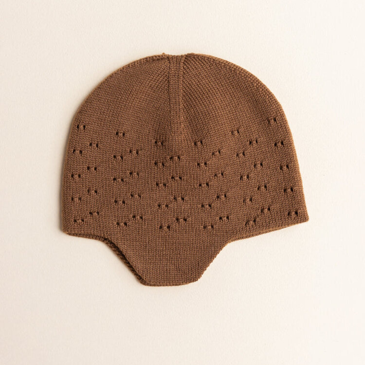 De muts heeft kleine gaatjes aan één kant. De andere kant is effen tricot, dus die houdt de wind en de kou buiten. Dat betekent: een warme muts die je oren warm houdt!
