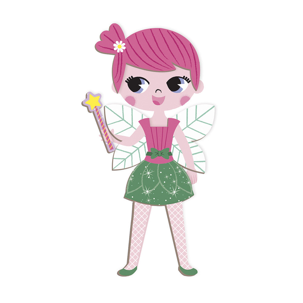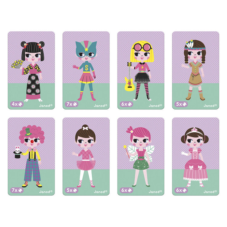 Educatief magneetspel van karton met vermommingen voor meisjes als thema. Bevat 46 magneten en 8 kaarten. Open het boek en maak dezelfde vermomming als deze die op de kaart is aangegeven met behulp van de magneten. Geschikt voor kinderen van 3-8 jaar.