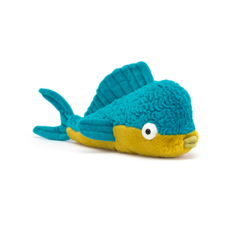 Delano Dorado Fish is een knuffel met flair. Met zijn schitterende goudgele tinten, speelse vinnen en glinsterende afwerking is hij een opvallende verschijning in de Jellycat-oceaan. Zijn zachte vacht en luxe uitstraling maken hem tot een betoverende metgezel voor jonge zeeavonturiers en knuffelliefhebbers.