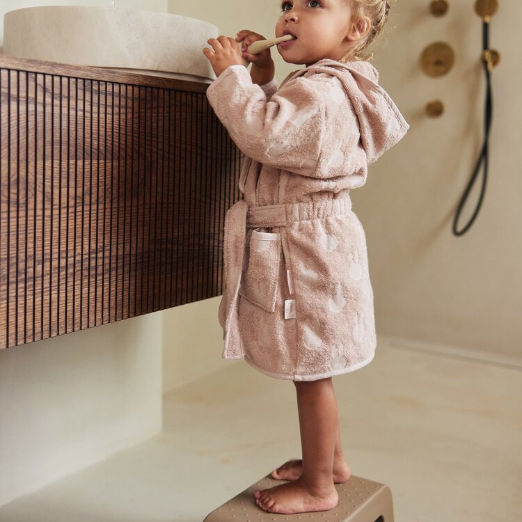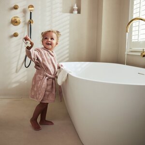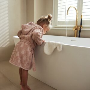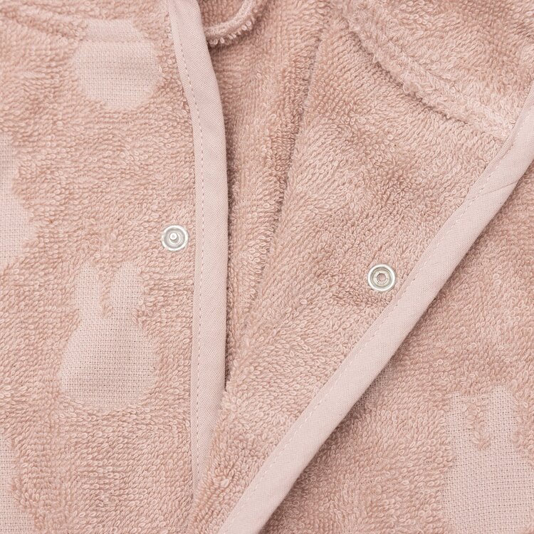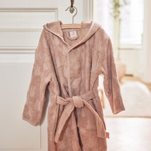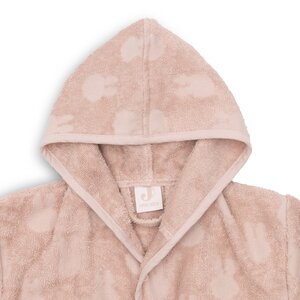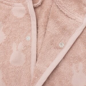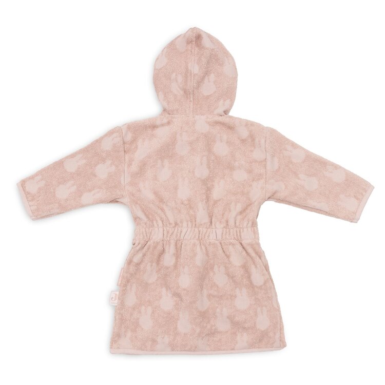 Super leuk badjasje met subtiele Nijntje touch. Een badstof badjasje is altijd handig voor jouw dreumes. De badjas is perfect om te gebruiken na het badderen, douchen of zwemmen. De zachte badstof neemt gemakkelijk water op en houdt daarmee jouw kleintje lekker warm. De capuchon droogt gemakkelijk de haartjes. Het badjasje is ook handig om mee te nemen op vakantie of mee naar een logeerpartijtje. Het badjasje heeft een handig drukknoopje om hem dicht te houden bij het dragen, elastiek in het rugpand voor de perfecte pasvorm en de ceintuur zit aan het badjasje vast zodat je hem niet kan verliezen. Het badjasje gebruik je al bij de leeftijd van 3 jaar en past tot ongeveer een leeftijd van 4 jaar. Dit is ook afhankelijk van hoe groot jouw kindje is. Het badjasje is effen van kleur en in de badstof is Nijntje ingeweven. Verkrijgbaar in olive green, nougat en wild rose.