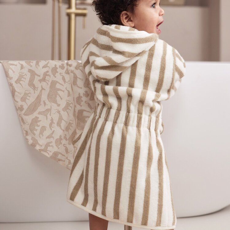 Beschikbaar in de maten 1-2 jaar en 3-4 jaar, passen deze schattige badjasjes perfect bij je kleintje. Kies uit trendy kleuren zoals Olive Green en Wild Rose en geef je kind het plezier van een warme en stijlvolle badjas na het badderen of zwemmen.