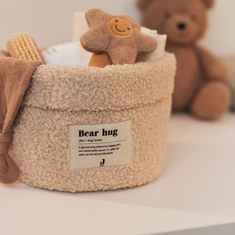 Praktisch mandje van zachte aaibare Bouclé stof om spulletjes in op te bergen. Het mandje is 14 cm hoog en heeft een diameter van 18 cm. Op de voorkant van het mandje vind je het leuke 'bear-hug' logo. Dit mandje is superhandig voor op de commode voor de kleine verzorgingsspulletjes zoals een manicuresetje, borsteltje en een thermometer. En tegelijkertijd een leuke accessoire om de babykamer net dat extra sfeer mee te geven. Met dit opbergmandje houdt je commode lades geordend. Een mandje voor sokjes, voor verzorgingsproducten en voor slofjes. Daarnaast staat dit ook nog een super leuk op de commode! Ook handig voor in de woonkamer voor klein speelgoed. Je combineert dit commodemandje ook heel leuk met de grote opbergmand Bouclé.