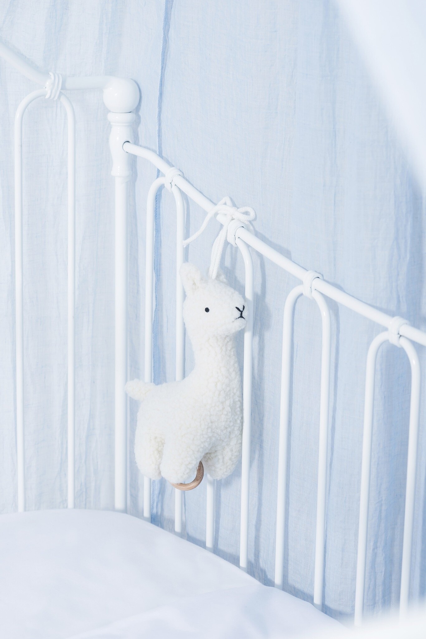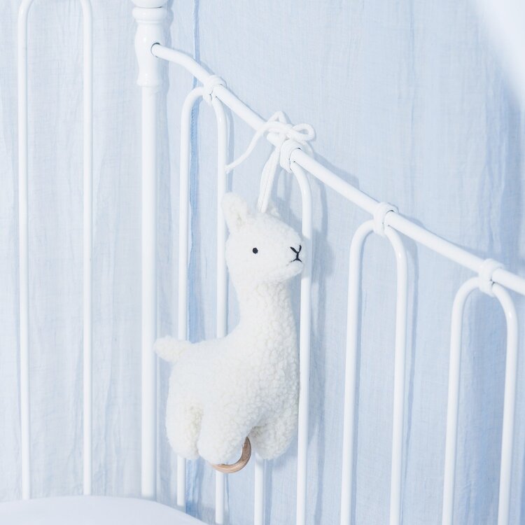 Een muziekje kan rustgevend werken voor een baby. Deze leuke muziekhanger met een lama heeft een houten ringetje aan het trekkoordje en touwtjes om de hanger aan op te hangen. De muziekhanger staat leuk in elke babykamer.