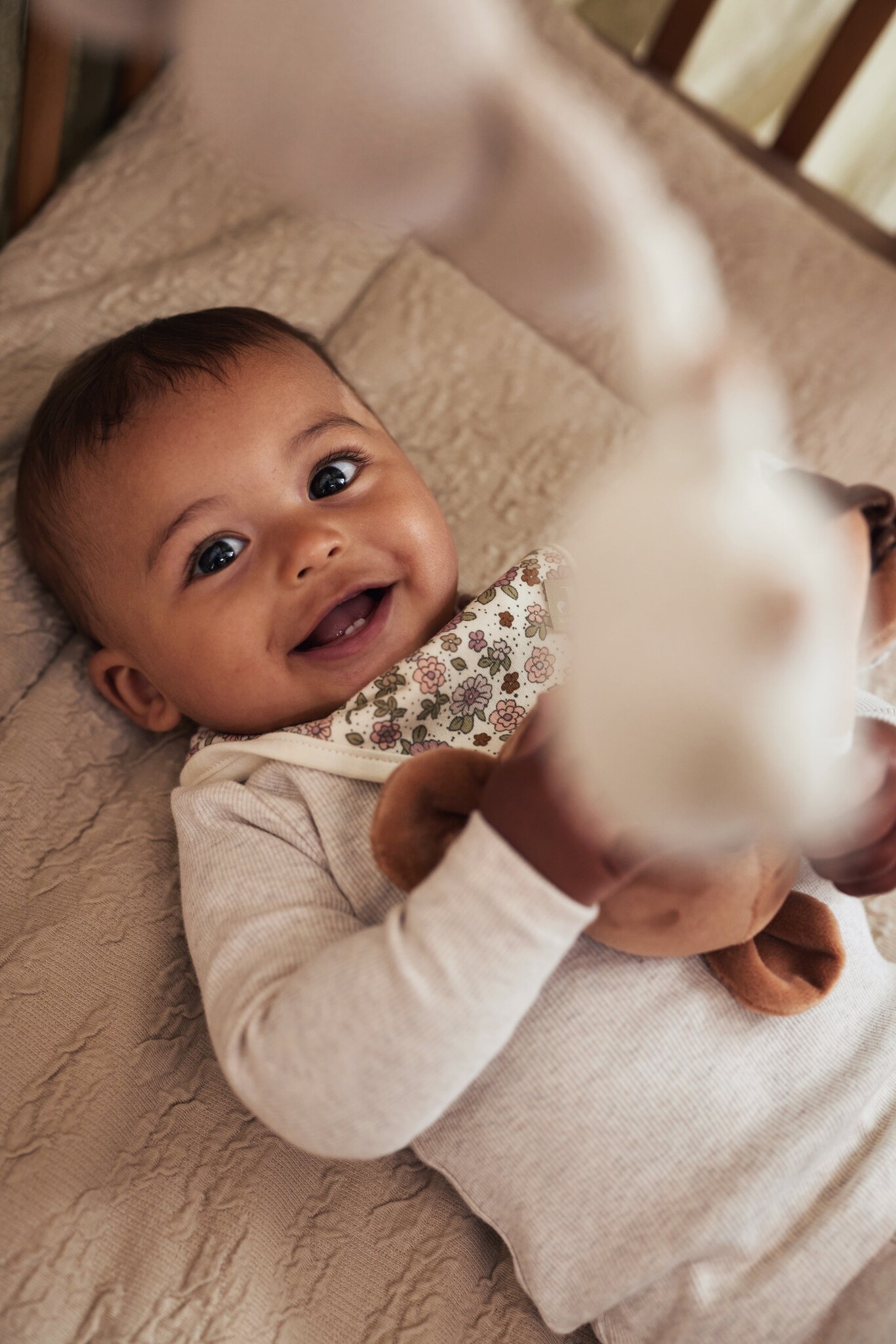 Heeft jouw kleintje last van doorkomende tandjes en wil jij het outfitje beschermen tegen kwijl? Of gebruik jij altijd een slabbetje bij het geven van vaste voeding en wil je eens iets anders dan een standaard slabbetje? Ga dan eens voor een hippe bandana. De Retro Flowers bandana heeft een vrolijk bloemenprintje. Door de handige drukknoopjes kun je het formaat gemakkelijk aanpassen en de bandana is gemaakt van OEKO-TEX gecertificeerd katoen. In de verpakking zitten 2 bandana's.