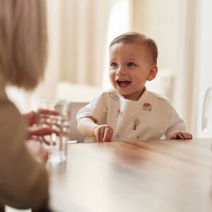 En waarom er aan de onderkant een dubbel laagje stof zit? Daar is over nagedacht! Je kindje laat tijdens het zelfstandig eten geregeld voedsel langs de kin over de slab druipen. De onderste rand van de slab vangt deze klodders en stukjes op. Een opvangbakje dus! Dát ga je waarderen!