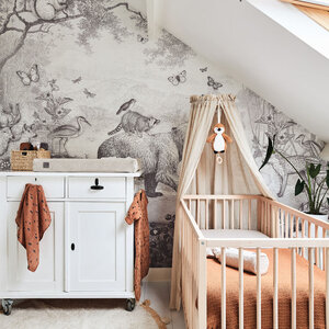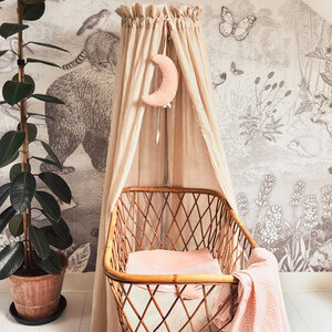 Deze stralende sluier is een sfeervolle decoratie voor de babykamer. En wist je dat een sluier ook tocht tegen houdt? Niet alleen mooi, maar dus ook erg handig. De sluier is eenvoudig te bevestigen aan een piekstok voor sluier (los verkrijgbaar). De sluier is maximaal 155cm hoog en heeft een diameter onderaan van 205cm.