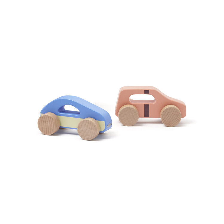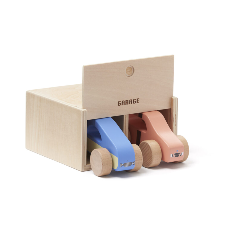 Griploze auto's voor de allerkleinsten. Het pakket bevatte een houten garage met ruimte voor de twee auto's. De auto's hebben een klein, geboord gaatje zodat je kunt doen alsof je de auto kunt opladen of tanken.