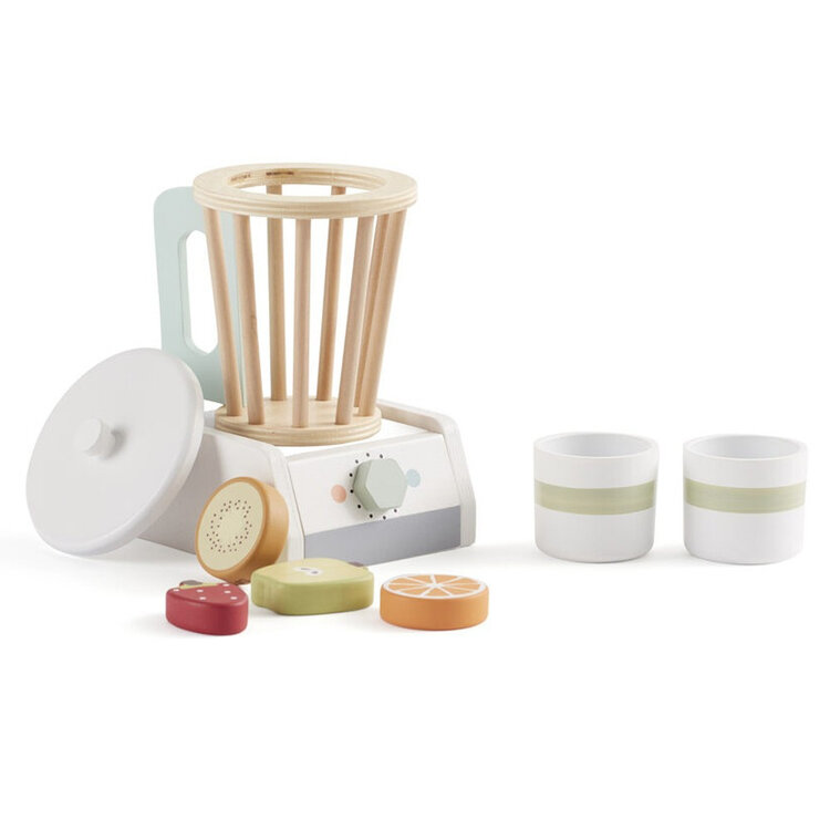 Maak een lekkere smoothie klaar voor al je poppen en knuffels. De houten Bistro Blender van Kid's Concept bestaat uit een blender met overheerlijke fruitschijfjes en 2 bekertjes. Haal het deksel eraf, gooi je fruitjes erin, draai aan de knop en mixen maar! Geschikt voor kinderen vanaf 3 jaar.