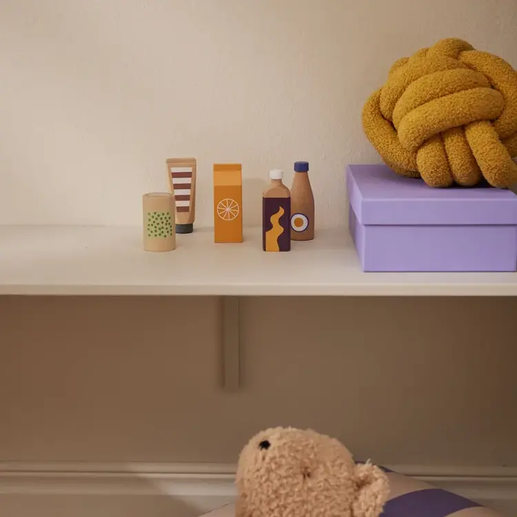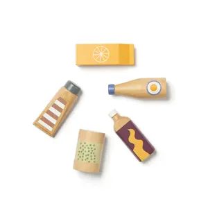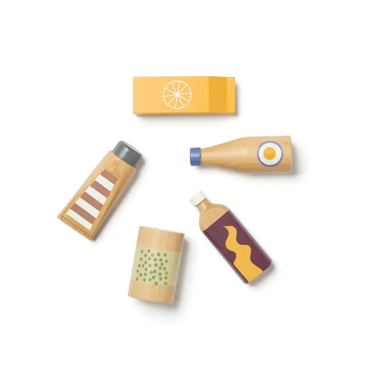 Deze houten flessen- en blikset uit de Kid's Hub-collectie is een must-have voor elke kleine kok of winkelier! De set bevat vijf verschillende houten flessen, potten, en blikken die kinderen kunnen gebruiken om hun fantasie te prikkelen en rollenspellen te spelen. Ideaal om de creativiteit te stimuleren, of ze nu denken dat het doperwten, sinaasappelsap, hete saus, ketchup, of mayonaise bevat – met deze set zijn de mogelijkheden eindeloos!