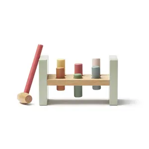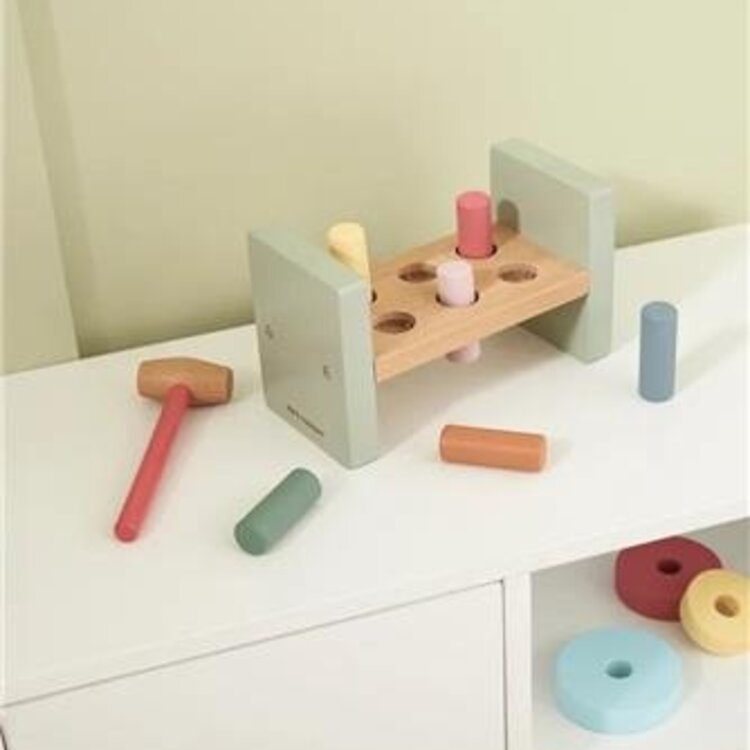 Een leuke en klassieke houten hamerbank voor kinderen. Als het kind alle stokjes erin heeft geslagen, is het gewoon een kwestie van het bord omdraaien en opnieuw beginnen – en opnieuw. Dit speelgoed helpt het kind zowel concentratie, coördinatie als de fijne motoriek te trainen. Klassiek, populair speelgoed waar je kind veel speelplezier van zal hebben.