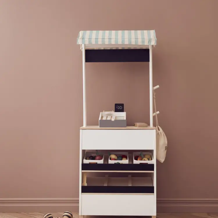 Open je eigen foodmark, ijskraam,of café met deze uitgebreid marktkraam. Laat het menu en de prijzen zien op de krijtborden die zowel in de schappen als daarboven te vinden zijn. Aan de zijkant vind je twee haakjes voor evt. tassen en elektriciteit. De speelgoedkassa is een leuke aanvulling op deze tijdloze marktkraam. In de marktkraam van Kid’s Concepts vind je verschillende slimme planken waar perfect boodschappen kunnen staan. Door het ontwerp en het materiaal is de marktkraam erg stabiel.