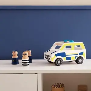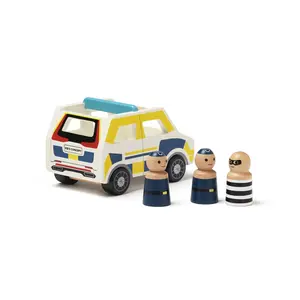 Een duurzame houten politieauto met zitplaatsen voor drie personen, die gemakkelijk door het open dak kan worden opgepakt en eruit gehaald.