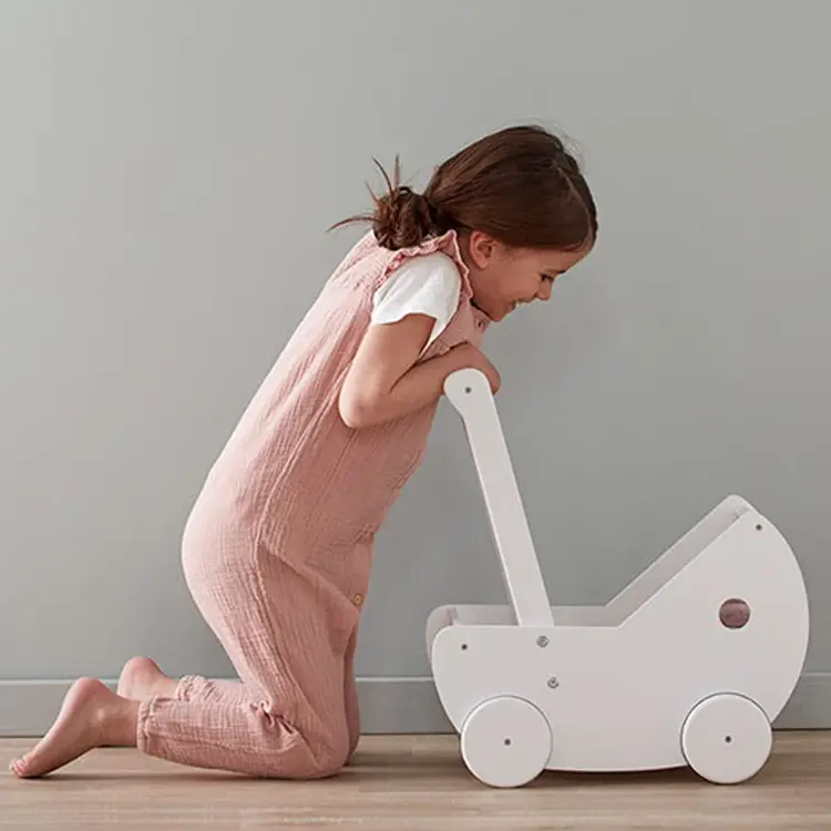 De lakens, deken en kussens zijn gemaakt van 100% katoen. De wielen hebben een rubber laagje. Dit betekent wat minder geluid en dat is voor volwassenen ook wel fijn. De poppenwagen rijdt stabiel en rustig. Voor kinderen die net hun eerste stapjes zetten, kan deze poppenwagen bovendien wat extra ondersteuning bieden.