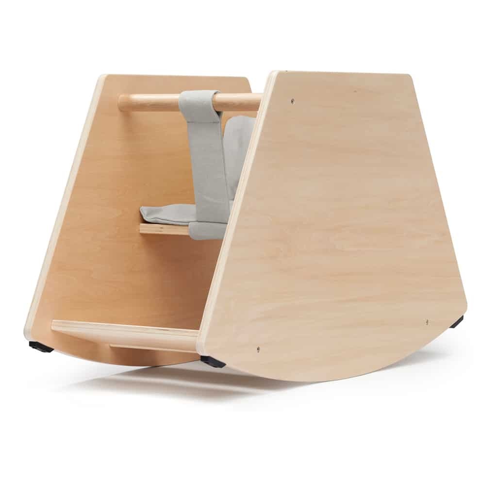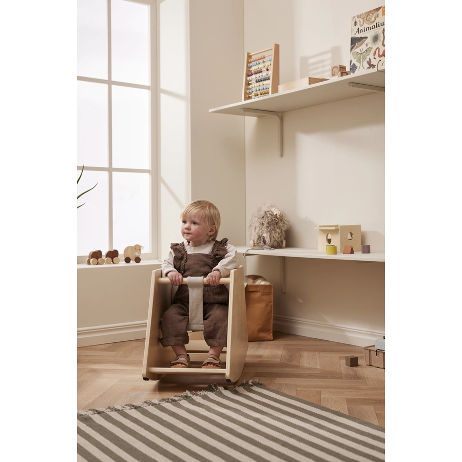Schommelen ontwikkelt het evenwicht en het lichaamsbewustzijn van het kind en traint de grove motoriek. Het kind zit comfortabel en stevig in het zitje met goede steun voor de rug en een makkelijk vast te pakken handvat. De schommelstoel heeft een stabiele constructie met afneembare en wasbare stof. De schommelstoel is leuk speelgoed dat vanaf jonge leeftijd perfect is en het evenwicht en het lichaamsbeeld van het kind traint. Het is klassiek speelgoed en het staat ook nog eens mooi in je interieur.