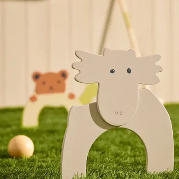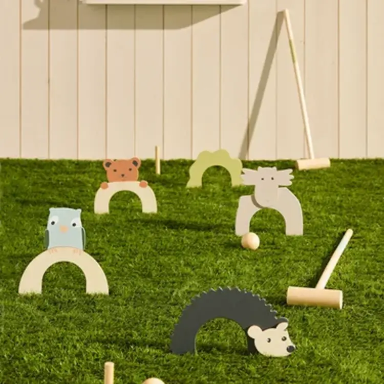 De houten croquetset EDVIN met Bo de Moose, Max de Beer, Stella de Hedgehog en Sus de Uil is perfect voor alle buitenevenementen, zoals informele middagen in het park. De set bevat twee croquethamers, 5 dierenhoepels, twee houten ballen en 2 knijpers. De set wordt geleverd met een handig katoenen tasje. De tas maakt het gemakkelijk om het spel op te bergen en zorgt ervoor dat het spel na gebruik droogt. Croquet spelen kan veel voordelen voor kinderen bieden, zoals het verbeteren van de hand-oogcoördinatie, motorische vaardigheden en sociale interactie. De set is geschikt voor kinderen vanaf 3 jaar. Als je er niet mee wilt spelen als croquetuitrusting, kun je ze gebruiken als schattige dierenfiguren in het bos. Prikkel hun verbeelding en inspireer hen om deel te nemen aan buitenactiviteiten. Ook kun je verhalen vertellen over de dieren en hoe ze leven.