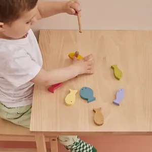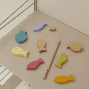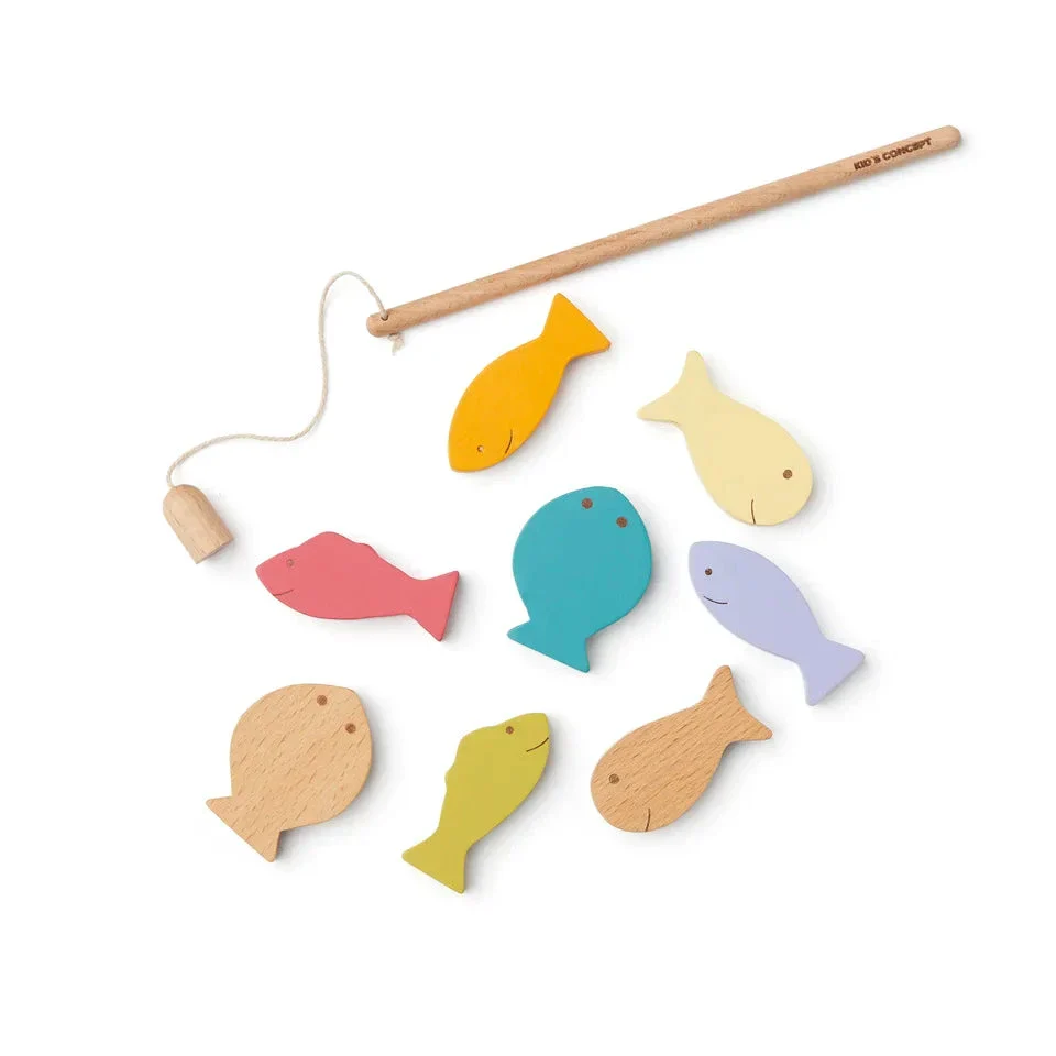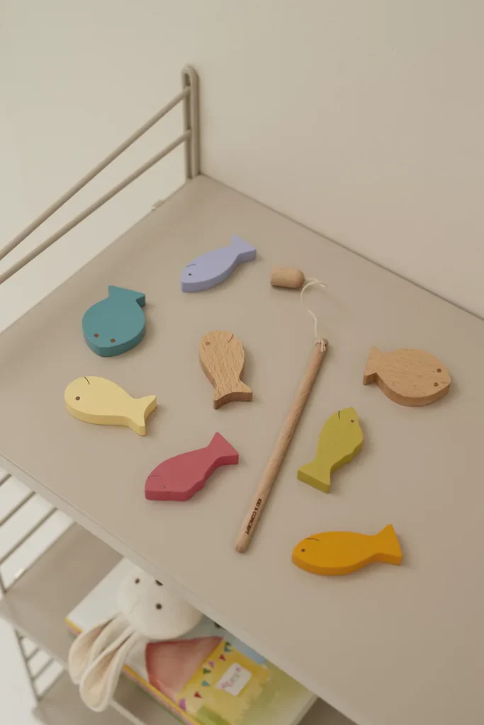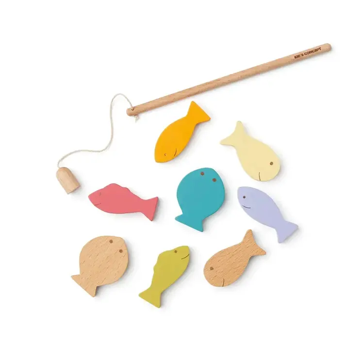 Het Visspel bevat 8 houten vissen en een hengel. Magneten verborgen in elke vis, en een magneet op de hengel die als aas dient. Wissel af met de hengel tijdens het vissen. Alles klaar voor een goede vistocht! Het visspel traint de hand-oogcoördinatie van kinderen, bevordert de fijne motoriek en de concentratie. Het spel wordt geleverd in een doos met een lint eromheen.