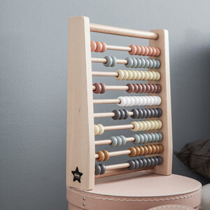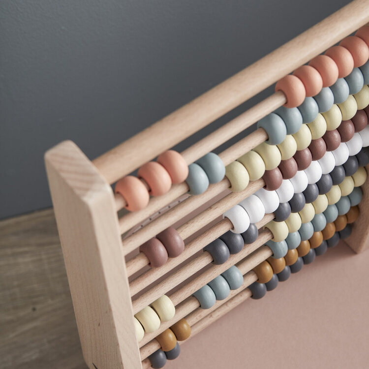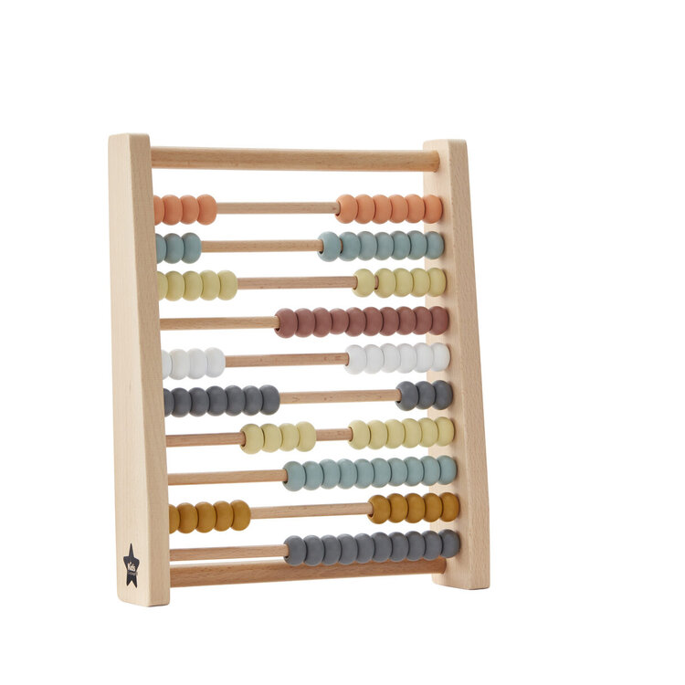 Een echte klassieker: dit houten telraam. Twee gele plus vier blauwe zijn zijn er samen zes. Maar wat gebeurt er als je er twee splitst? eren telen wordt een stuk eenvoudige met het houten telraam van Kid’s concept.