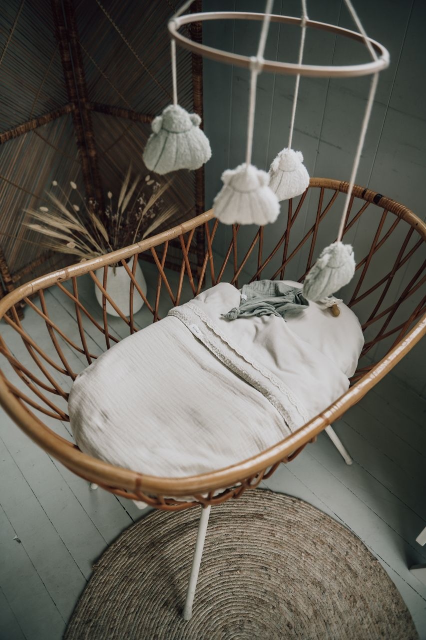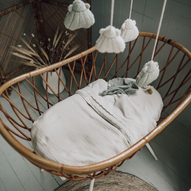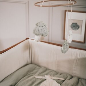 Deze mobiel met houten ring en schelpen van badstof in twee neutrale kleuren voert je mee naar een lange lome zomer. Hang mobiel Mana boven het bedje of de box van je baby en laat hem heerlijk wegdromen.